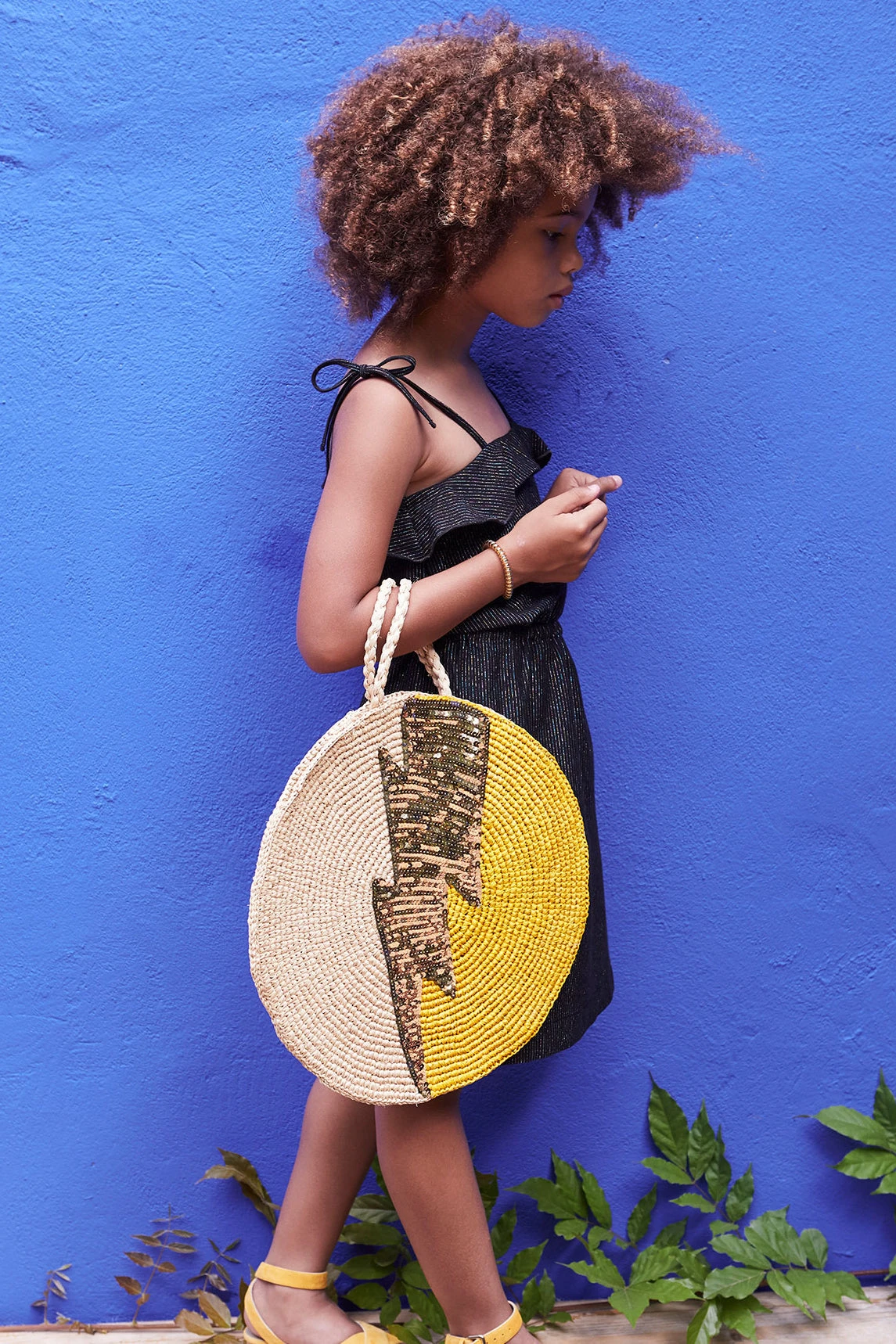 in a dark midnight color with a wide ruffle at the top and shiny lurex stripes. Features bow tie straps at the shoulders. 100% cotton, machine wash cold. Recommend sizing up.