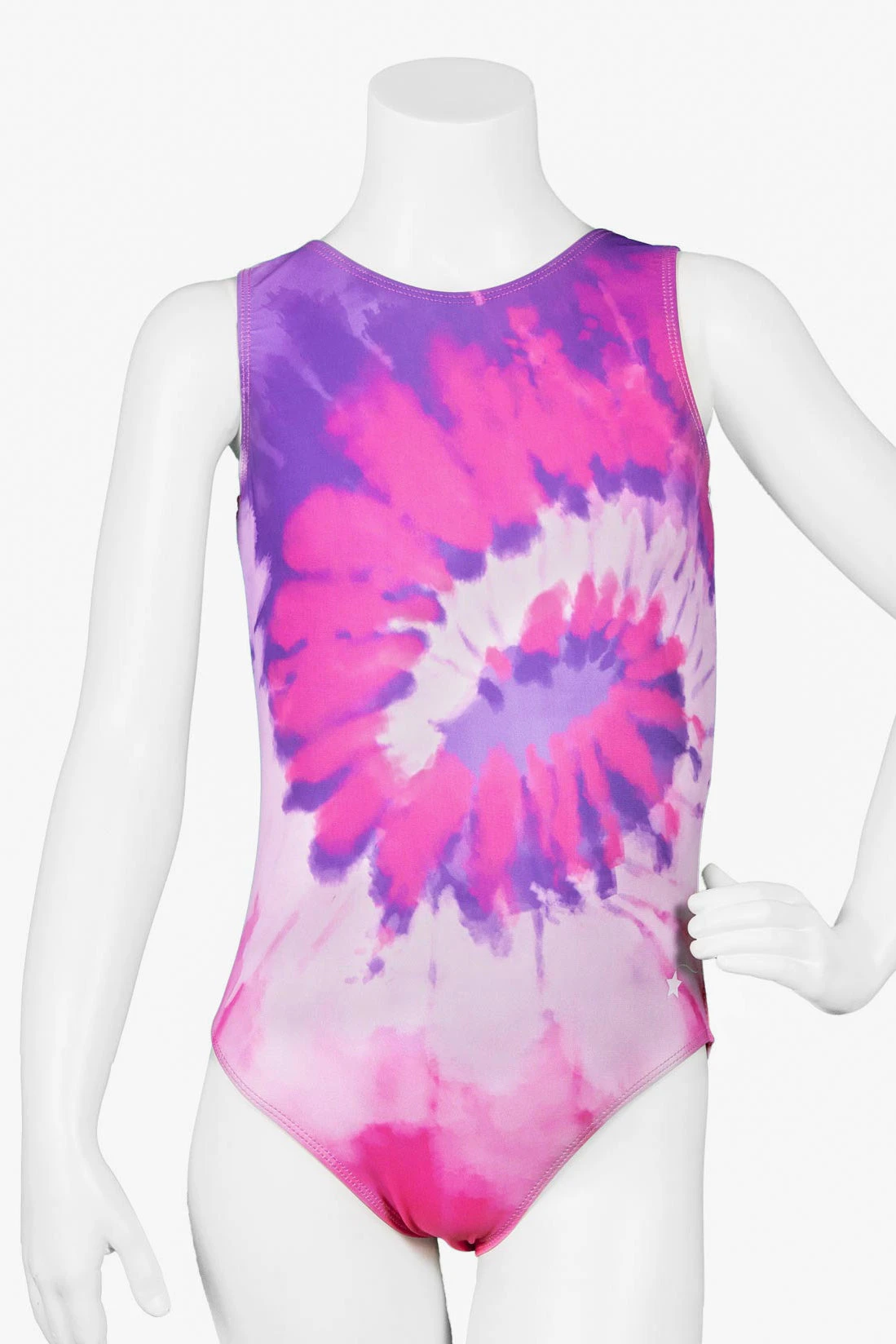 features a bold tie dye swirl in vibrant pinks and purples. This
