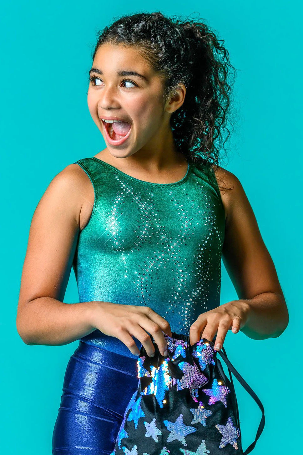 features a cascade of white crystals over a lustrous hologram fabric which has a liquid shine that glows and sparkles, and adds remarkable depth to colors. The Perfect Tank styling is designed for comfort and superior mobility for yourÂ
