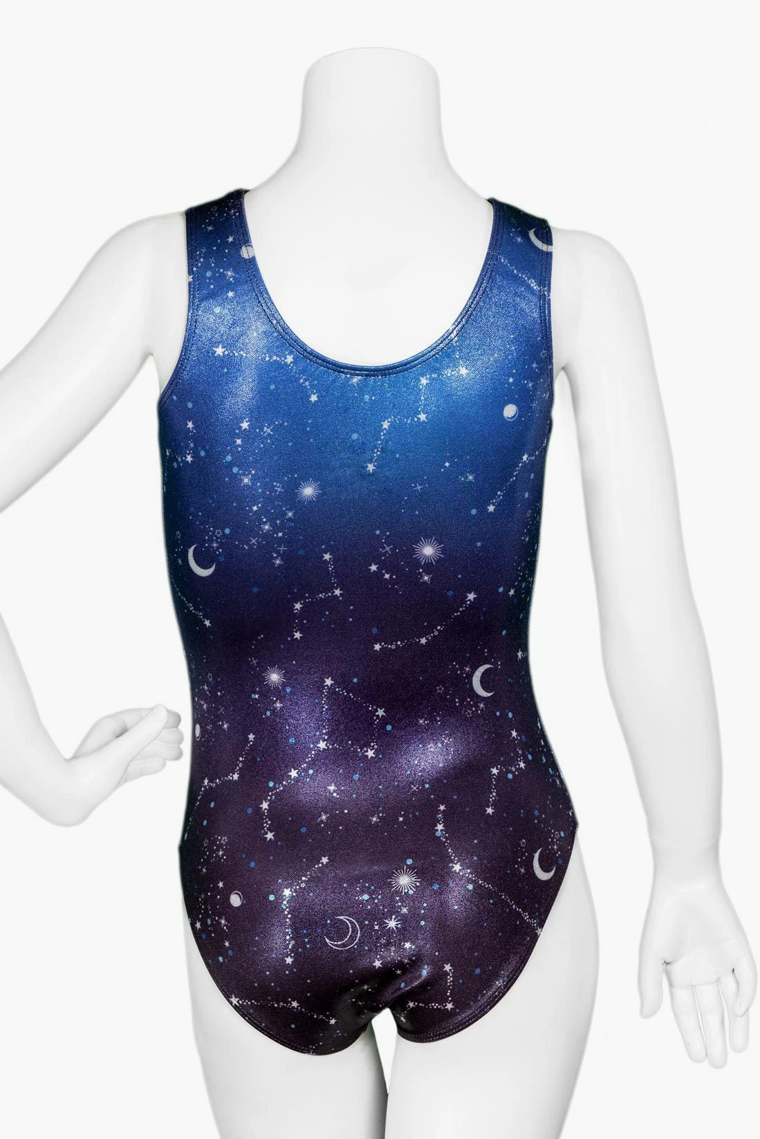 features a beautiful galaxy theme over an ombre hologram fabric fading from shimmery blue to deep purple. This