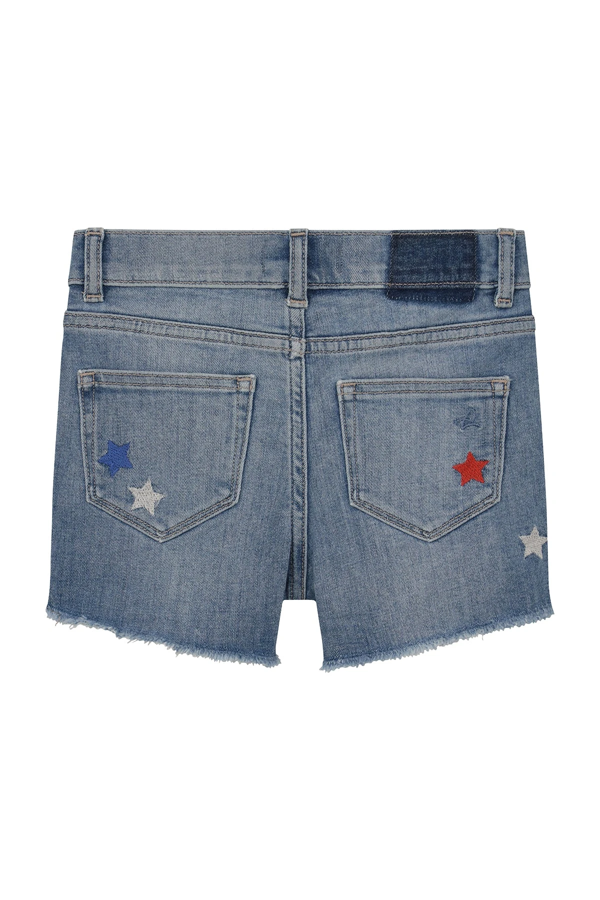 with red, white and blue embroidered stars throughout. Features front and back pockets, belt loops and a raw hem for added