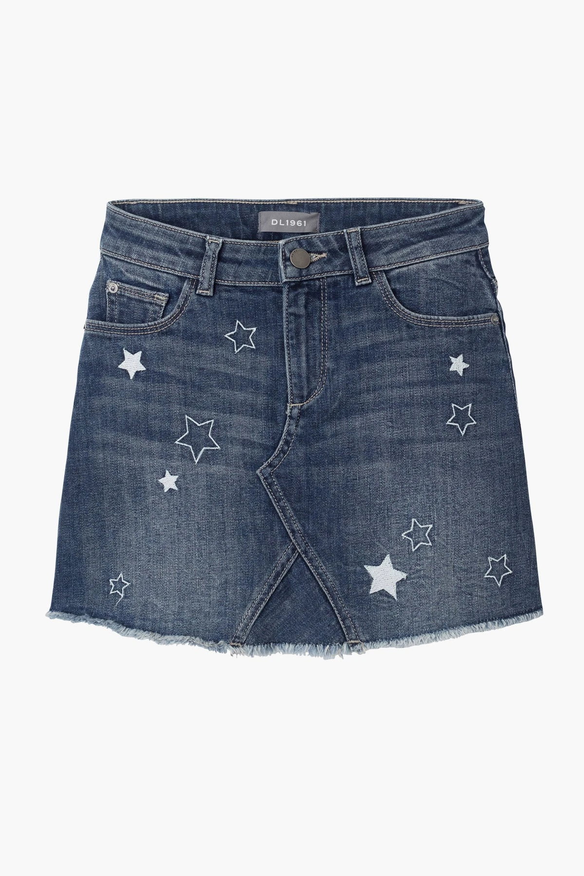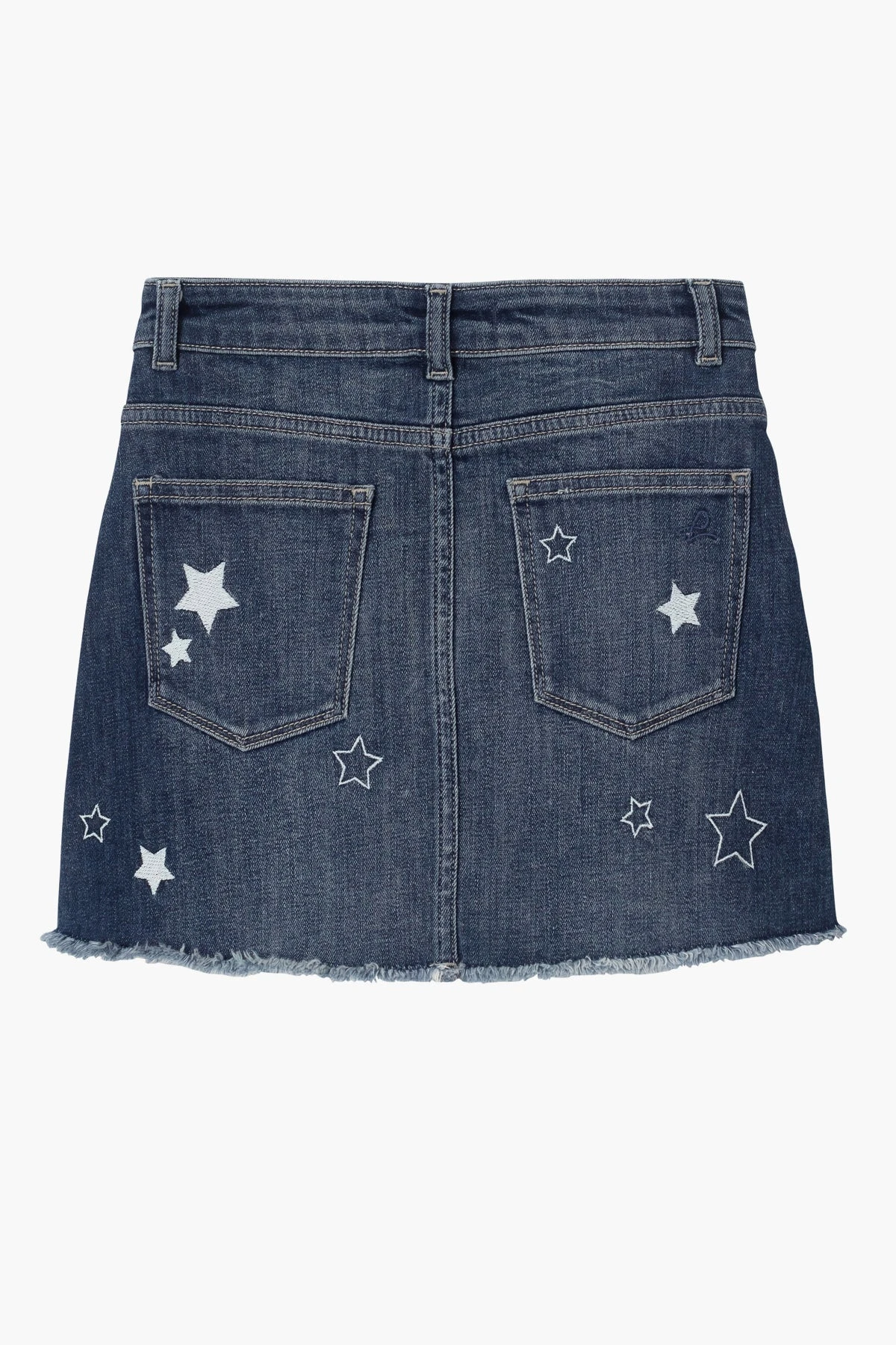 features a raw hem along the bottom, front and back pockets and star embroidery. Length hits above the knee. 98% cotton, 2% lycra, machine wash.