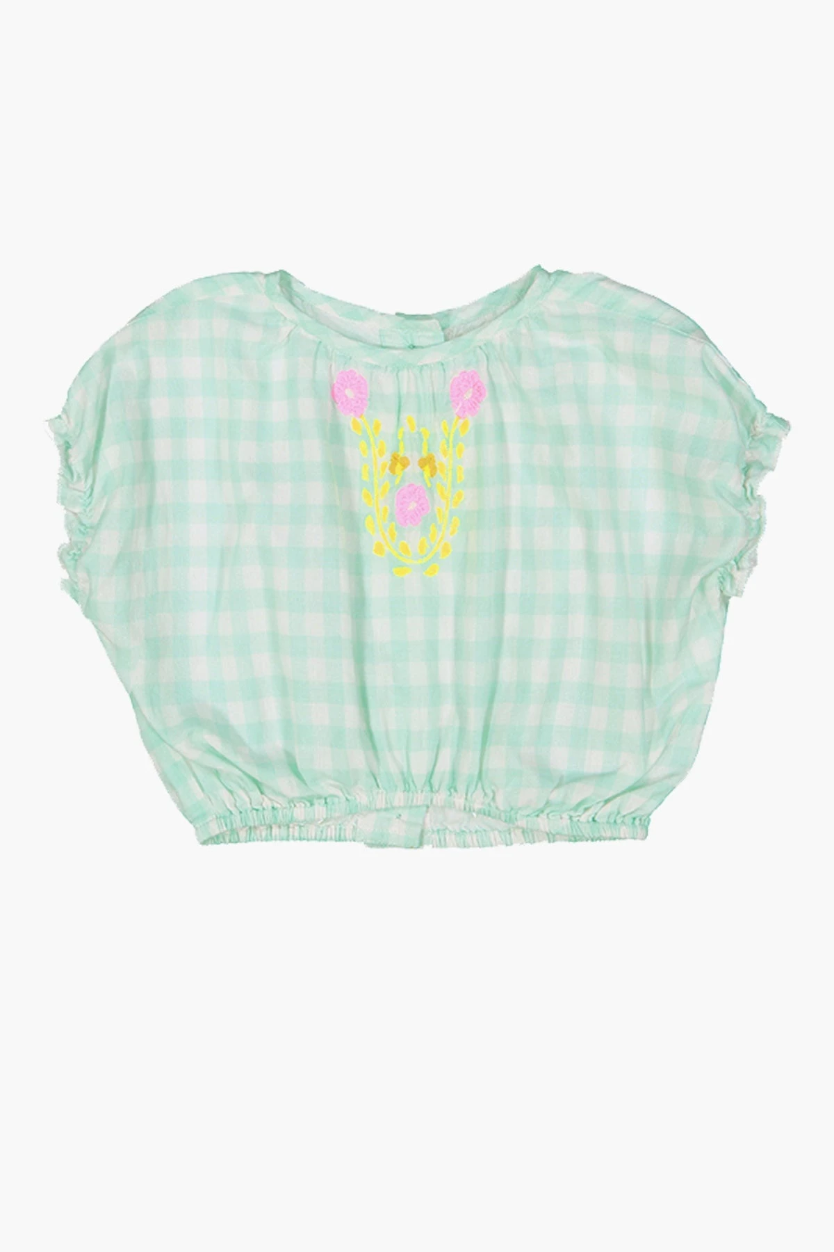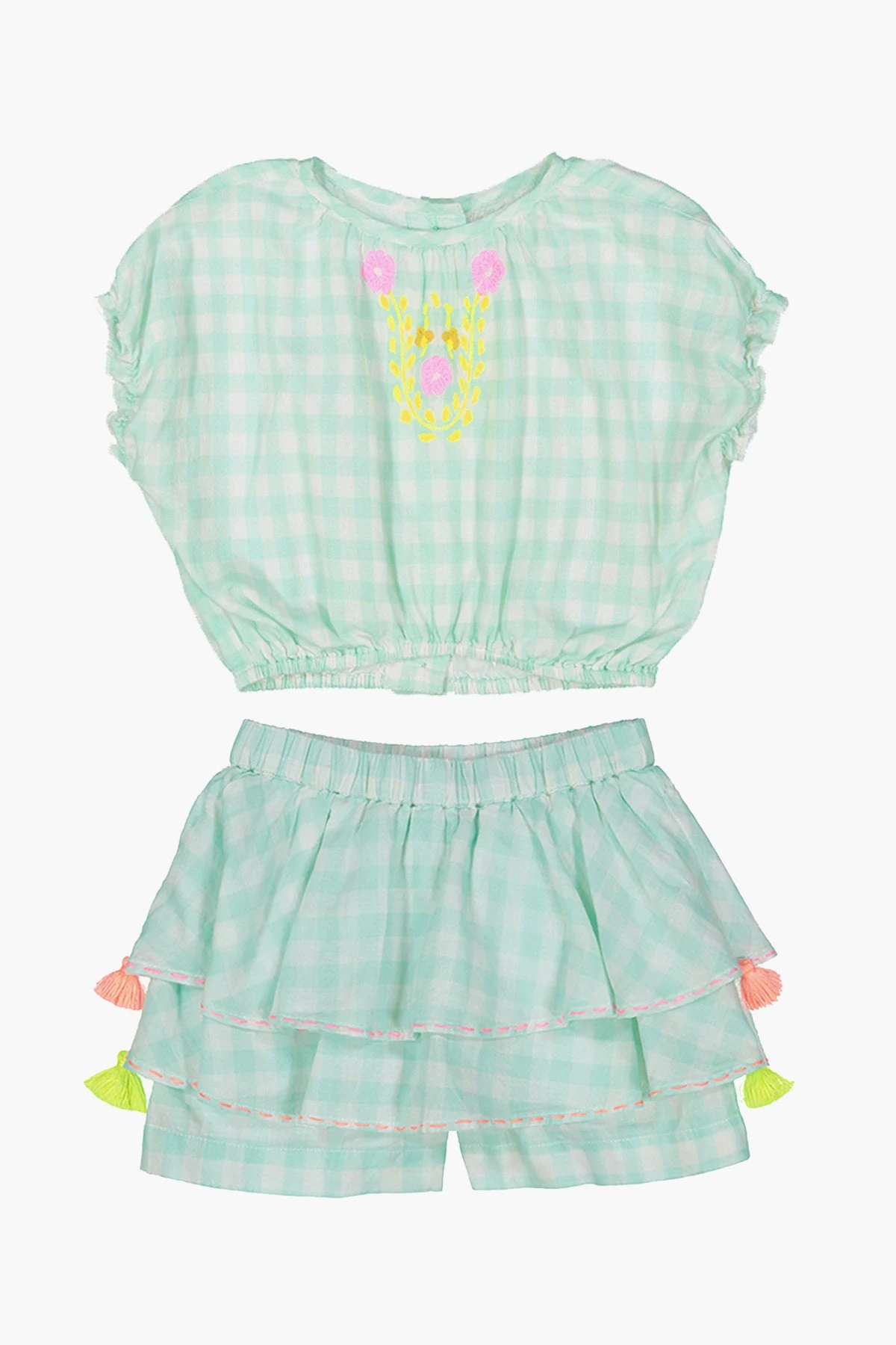 with tiered ruffles and tassels at the sides. 100% cotton, machine wash.