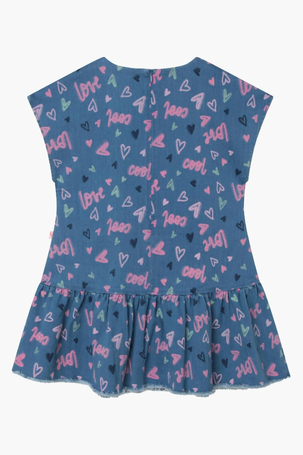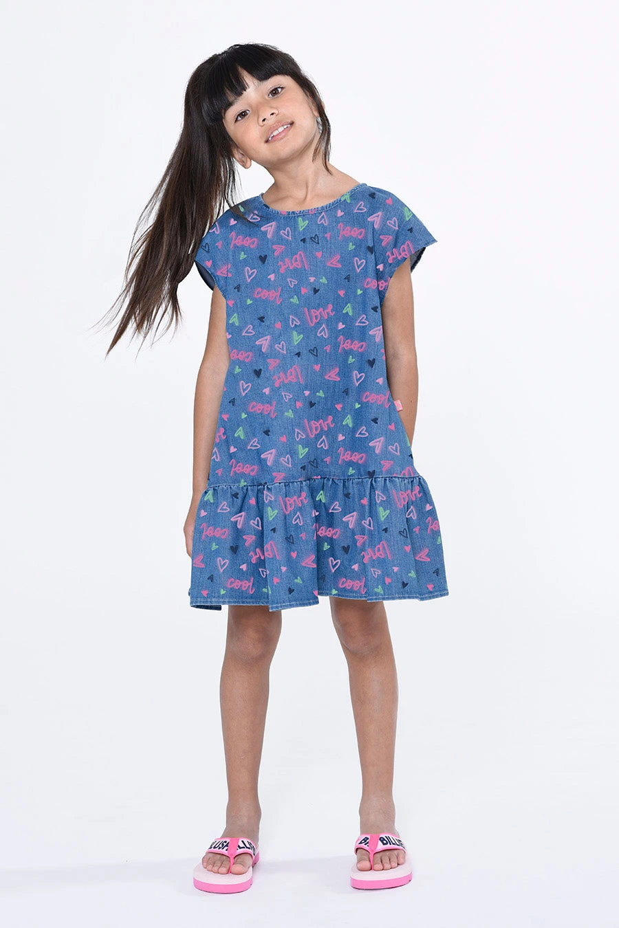 ‘s Love Girls Dress is a loose fit denim colored dress in a fun print. Features a drop waist and cap sleeves. 100% cotton, machine wash.