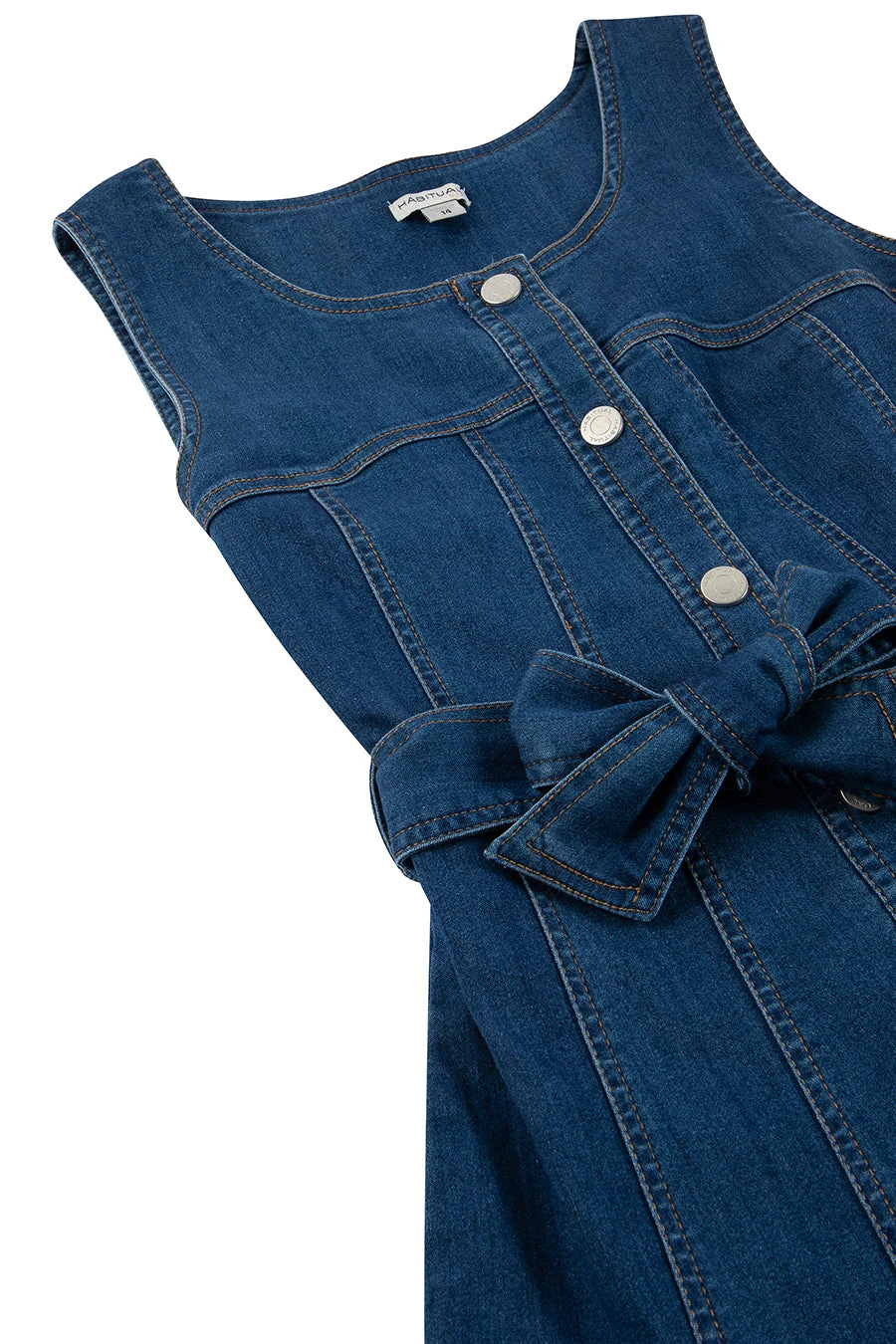 with a tie at the waist, a wide ruffle along the bottom and snap button detailing on the front. 57% cotton, 32% polyester, 10% rayon, 1% spandex, machine wash.