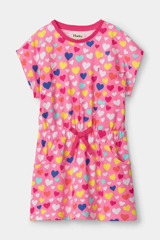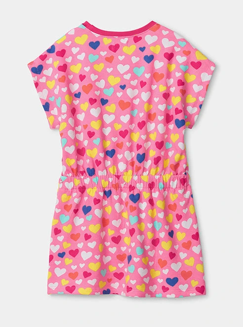 all over heart print, along with a delicate pink bow on the waist. Made with side pockets and a cinched waist to ensure the best fit. Pair with favorite sneakers or sandals to complete this cool outfit. Made in