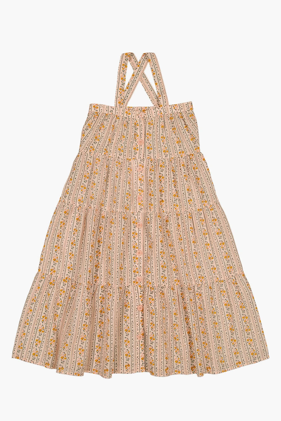 vintage floral print. Features criss-cross shoulder straps for a secure fit. The buttons down the front add a fun pop ofÂ
