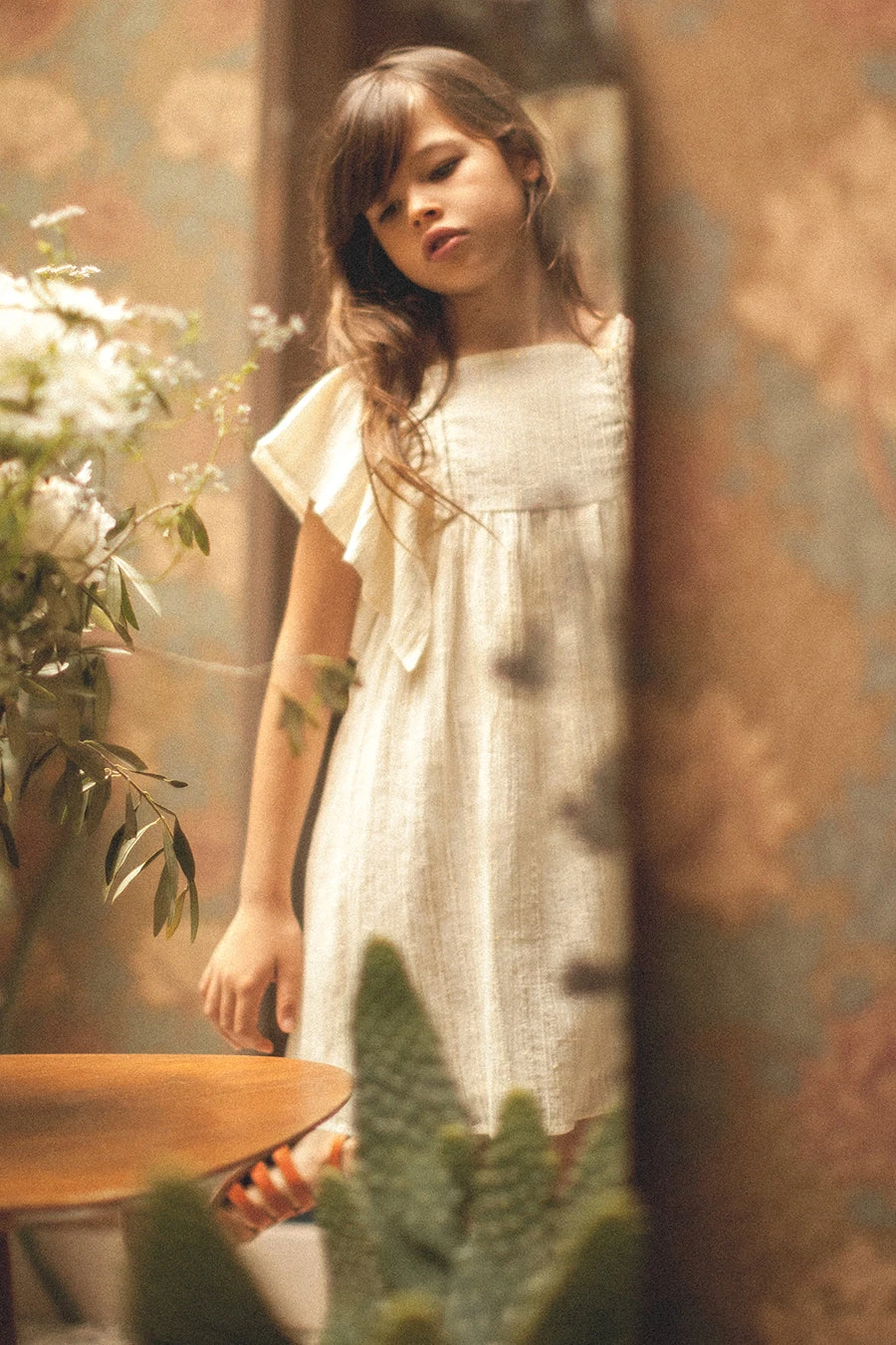 charm. Features oversized flutter sleeves and a zippered back. The subtle and