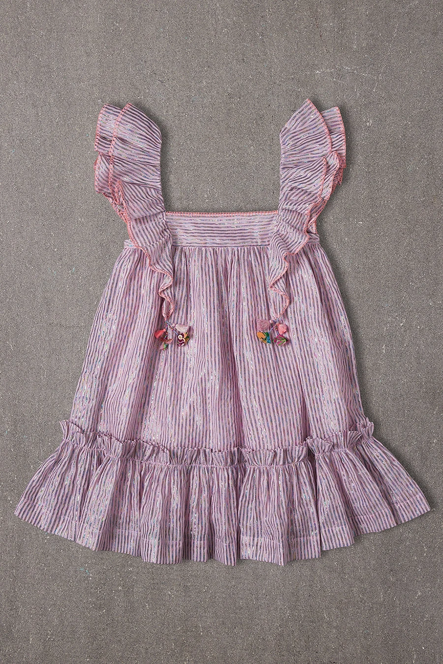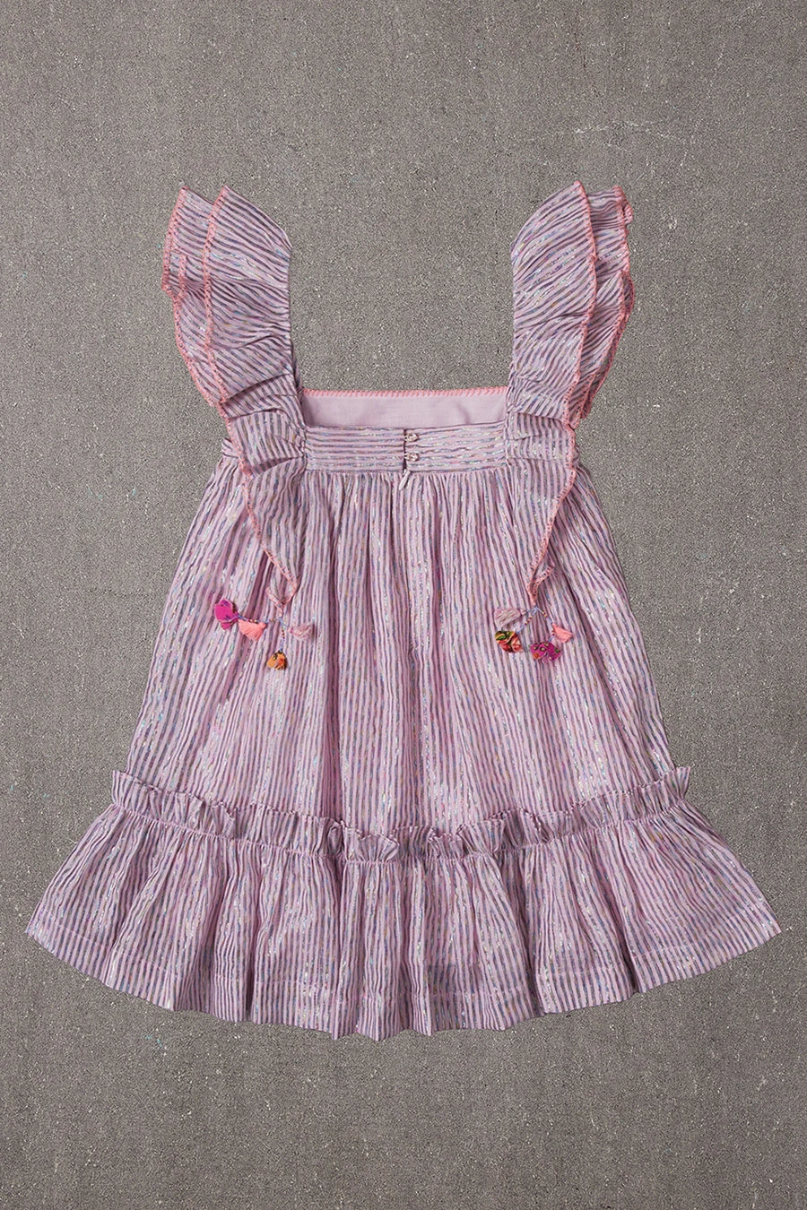 with oversized ruffle sleeves that finishes with flower pompoms, and is decorated with embroidery on the sleeves. Perfect to wear to a