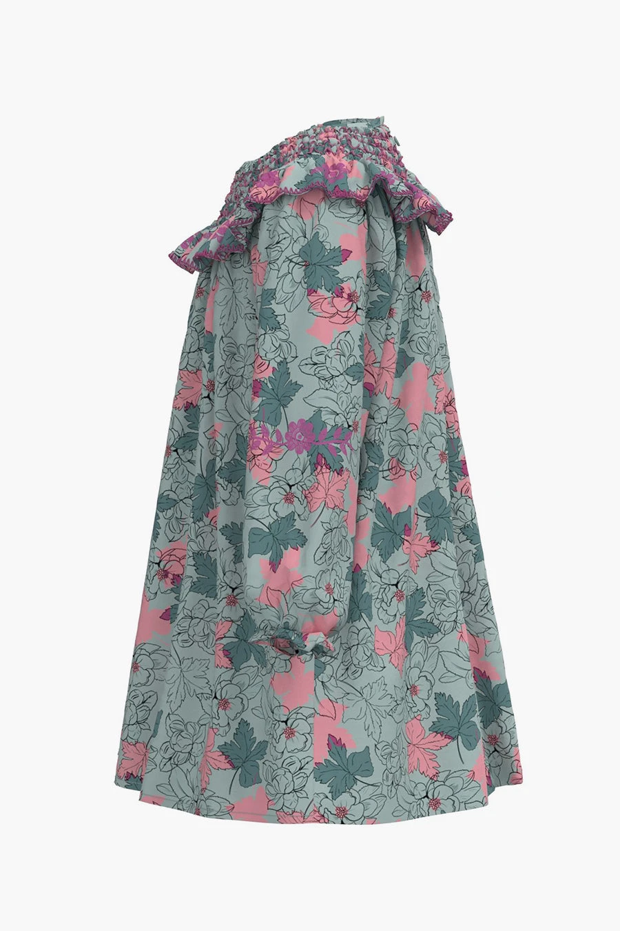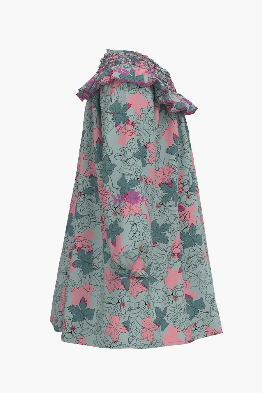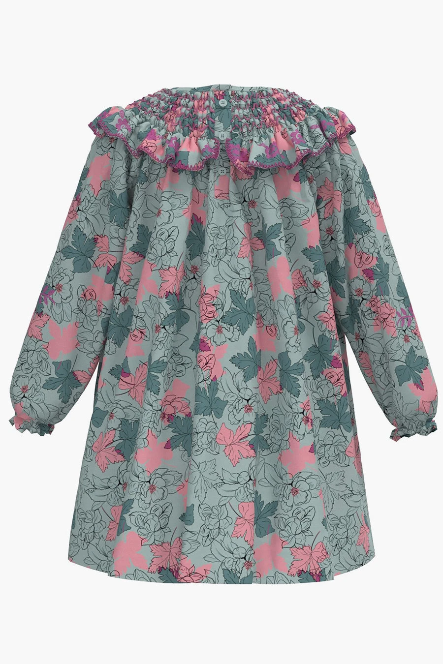 is a bright and colorful floral print dress with smocking and ruffles along the neckline. 100% french terry cotton, machine wash.