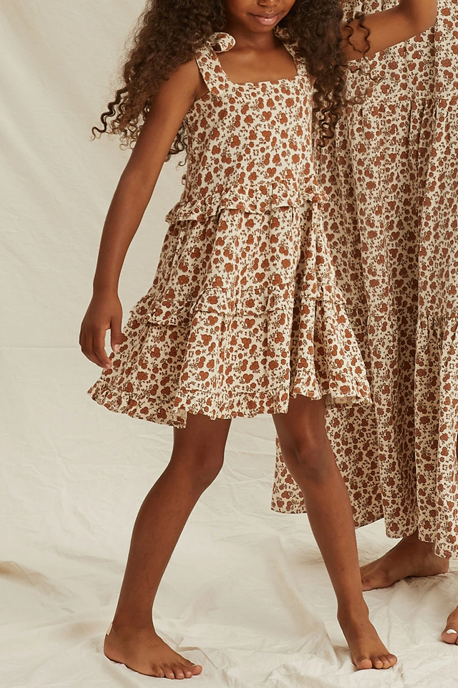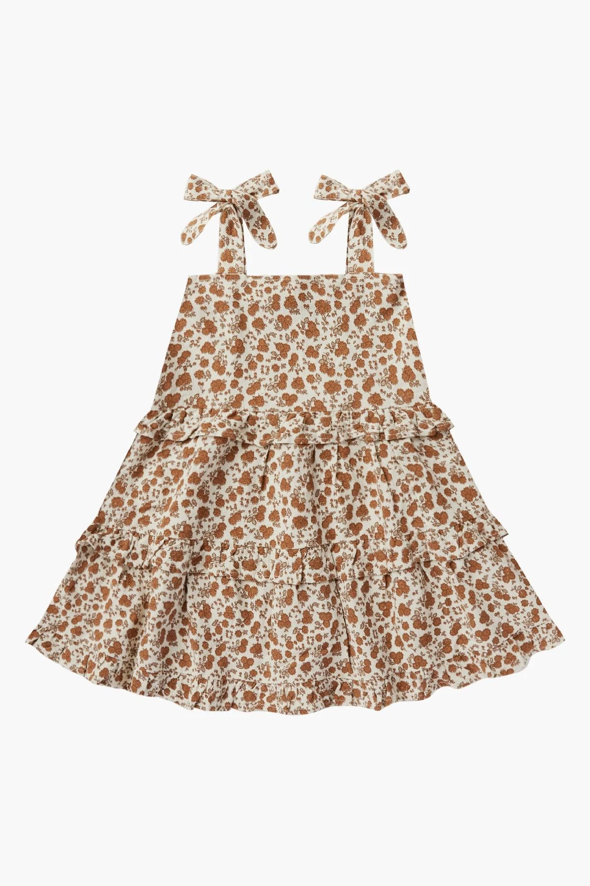 featuring tiers of ruffles and tie straps with bows. 50% linen, 50% viscose, machine wash.