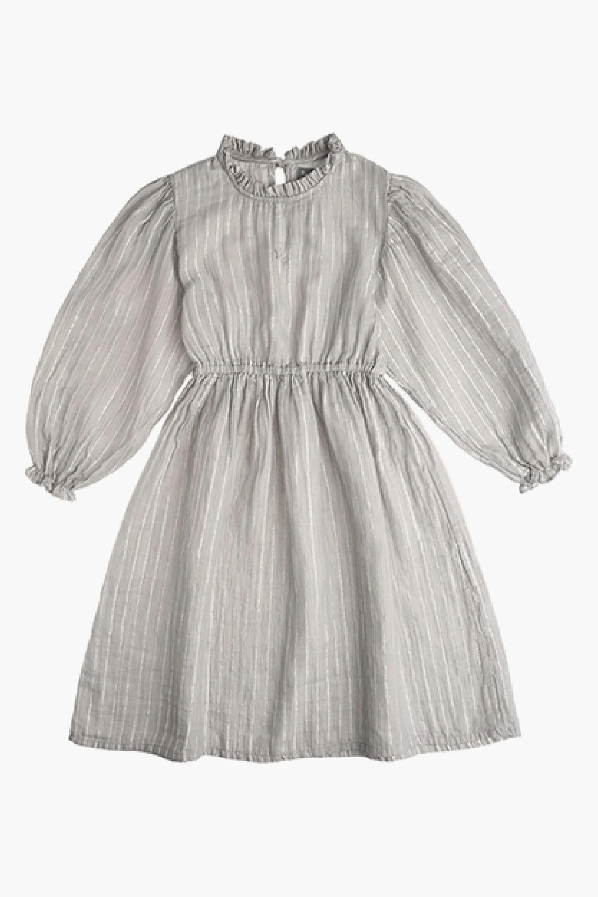featuring puff sleeves that gather at the wrist, a fixed waist, ruffles at the neck, and allover silver lurex striping. 98%