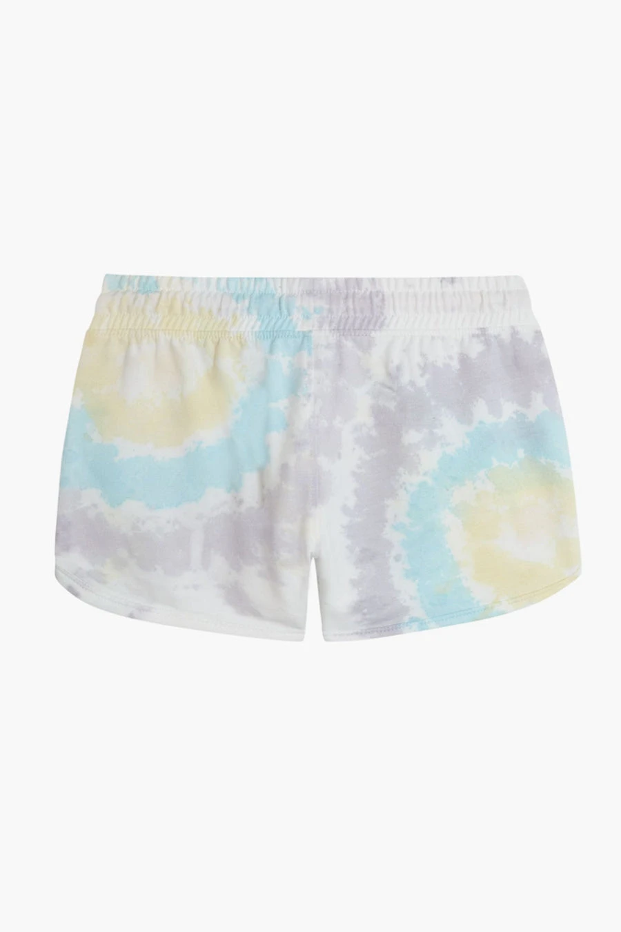 are a great, everyday short in a knit fabric with a tie dye effect, finished edge, elastic waistband with adjustable draw-cord and a soft hand finish. 63% polyester, 33% rayon, 4% spandex, machine wash.