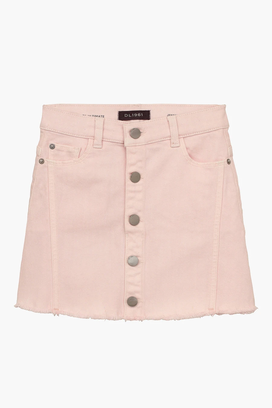 in Rose Lychee is a soft pink jean skirt with seam detail on the front. It features tonal stitching, brushed silver hardware, a center front button placket and a raw hem. 67% cotton, 19% modal, 12.5% lyocell, 1.5% lycra, machine wash.