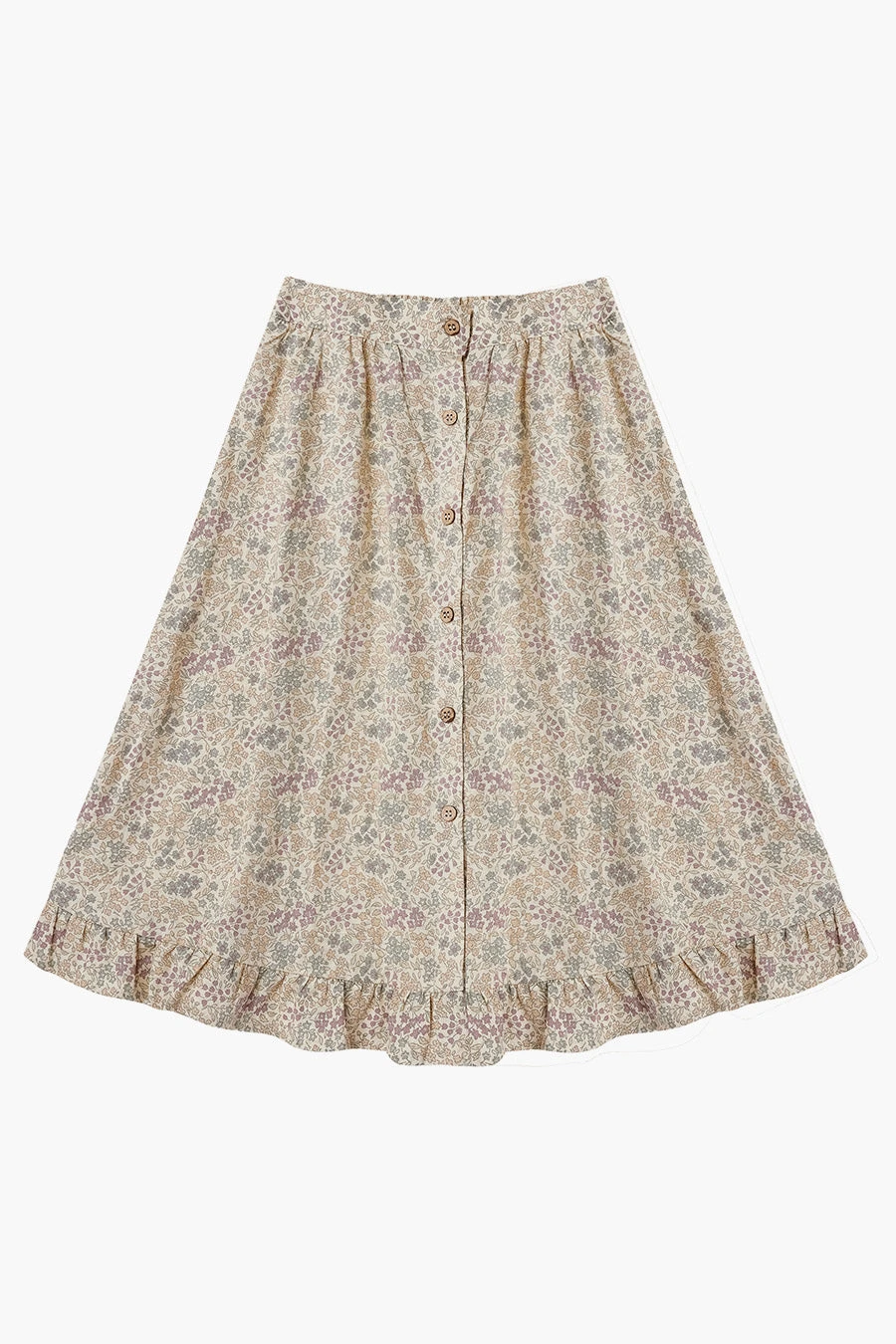 is a button front A-line skirt which features side pockets and a ruffle trim at the bottom opening. Pair with a favorite t-shirt and