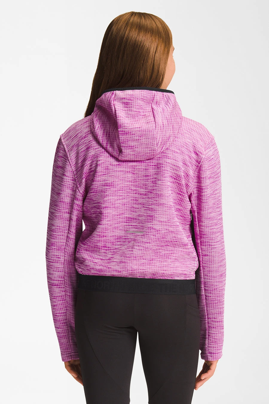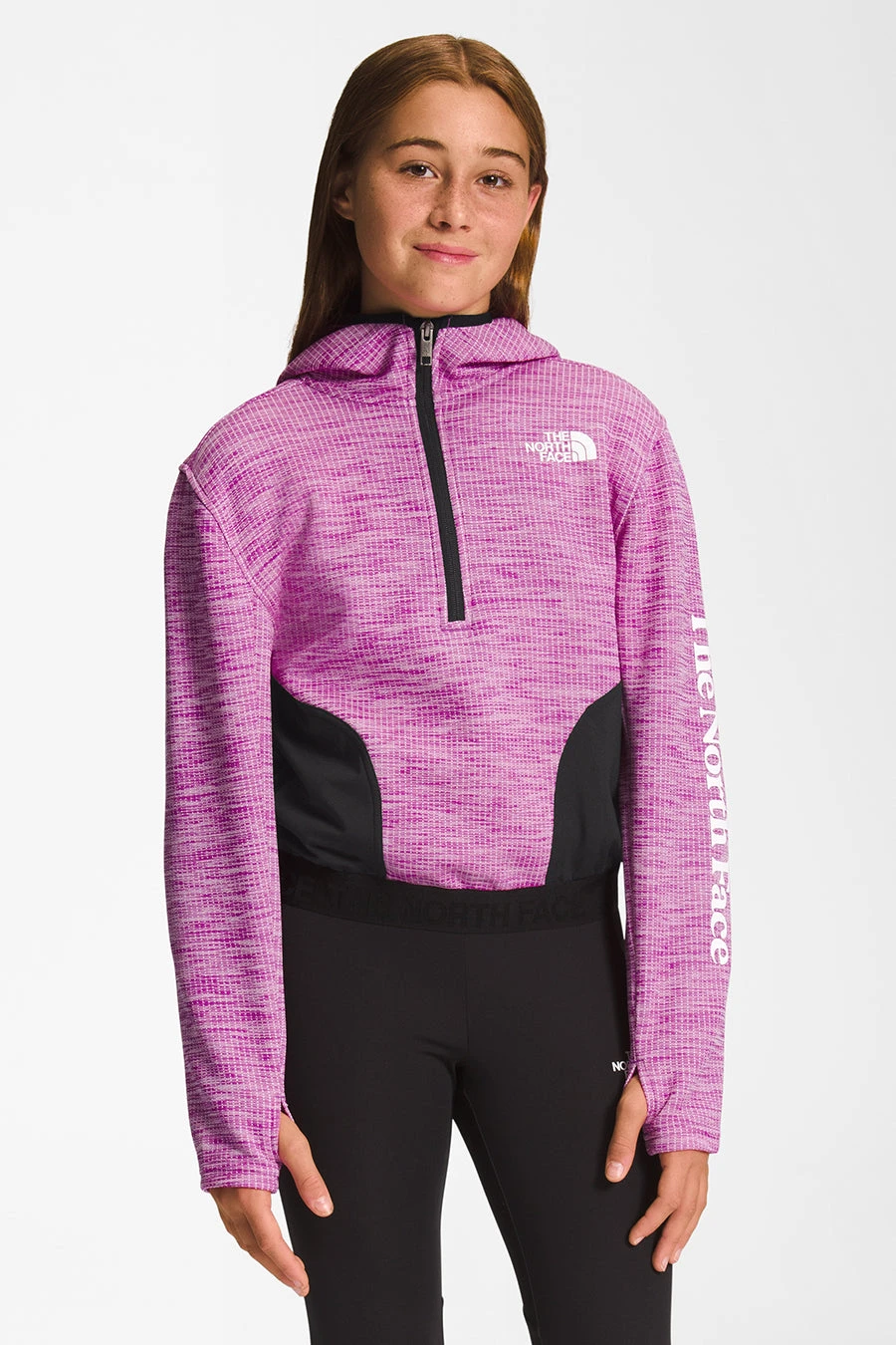 . Features quilted thermal fabric with a grid pattern, attached, three-piece hood with elastic binding, reverse-coil center front half zip with a zipper garage, set-in sleeves, reverse-coil-zip, mesh patch hand pockets, branded exposed-elastic hem, thumbholes at cuffs and reflective bar on back.