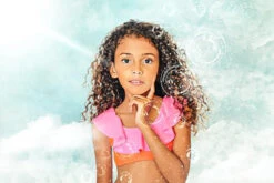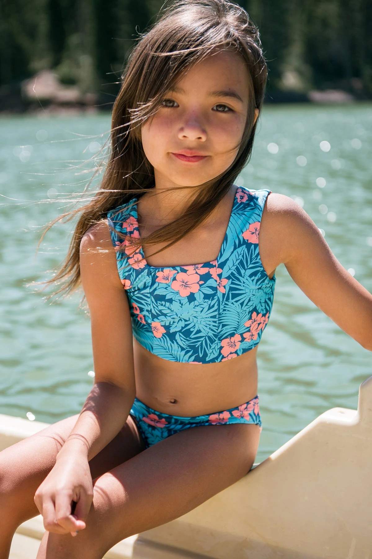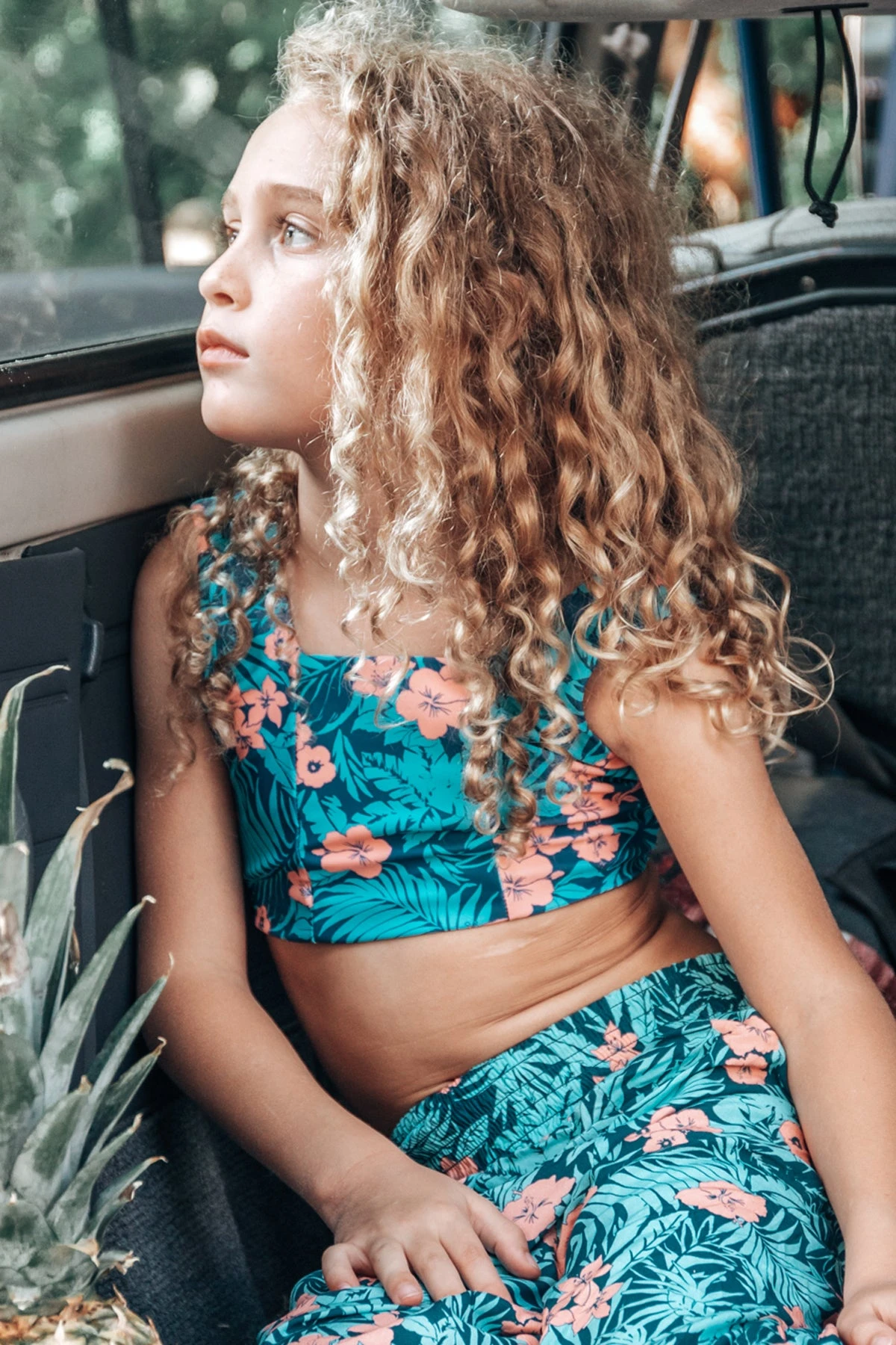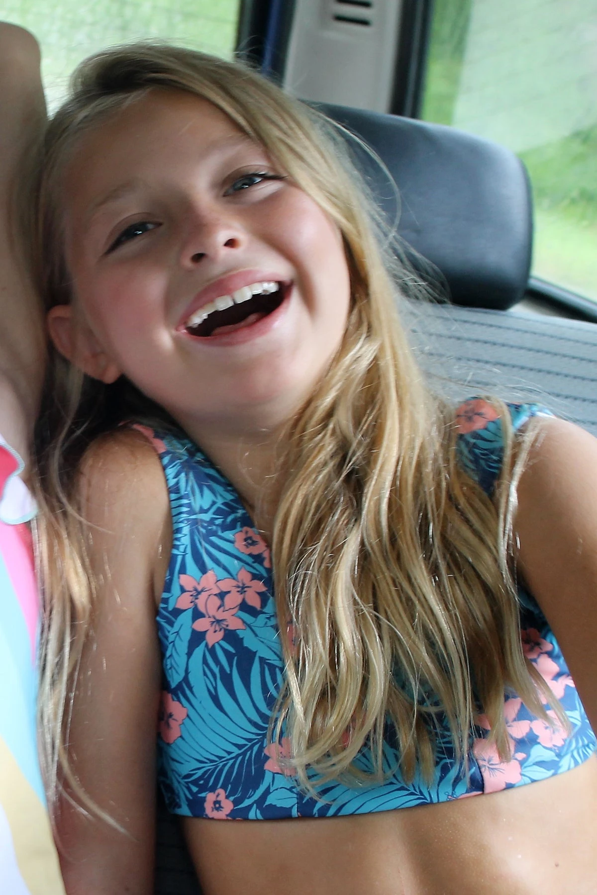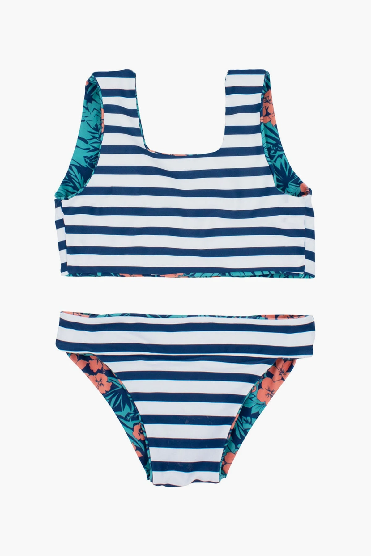 featuring a floral design on one side, horizontal stripes on the other and UPF 50+ sun protective material. 80% nylon, 20% elastane, machine wash cold.