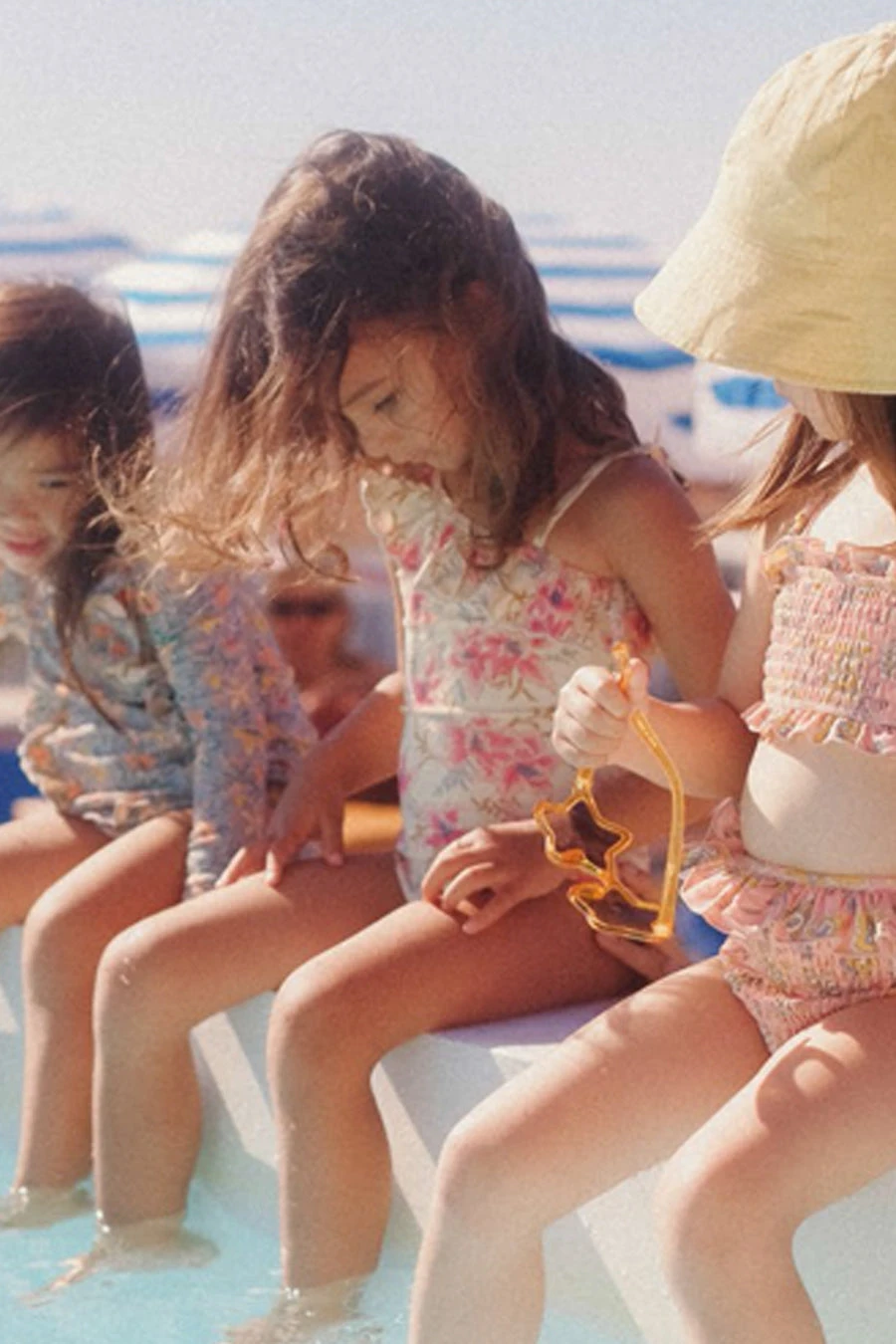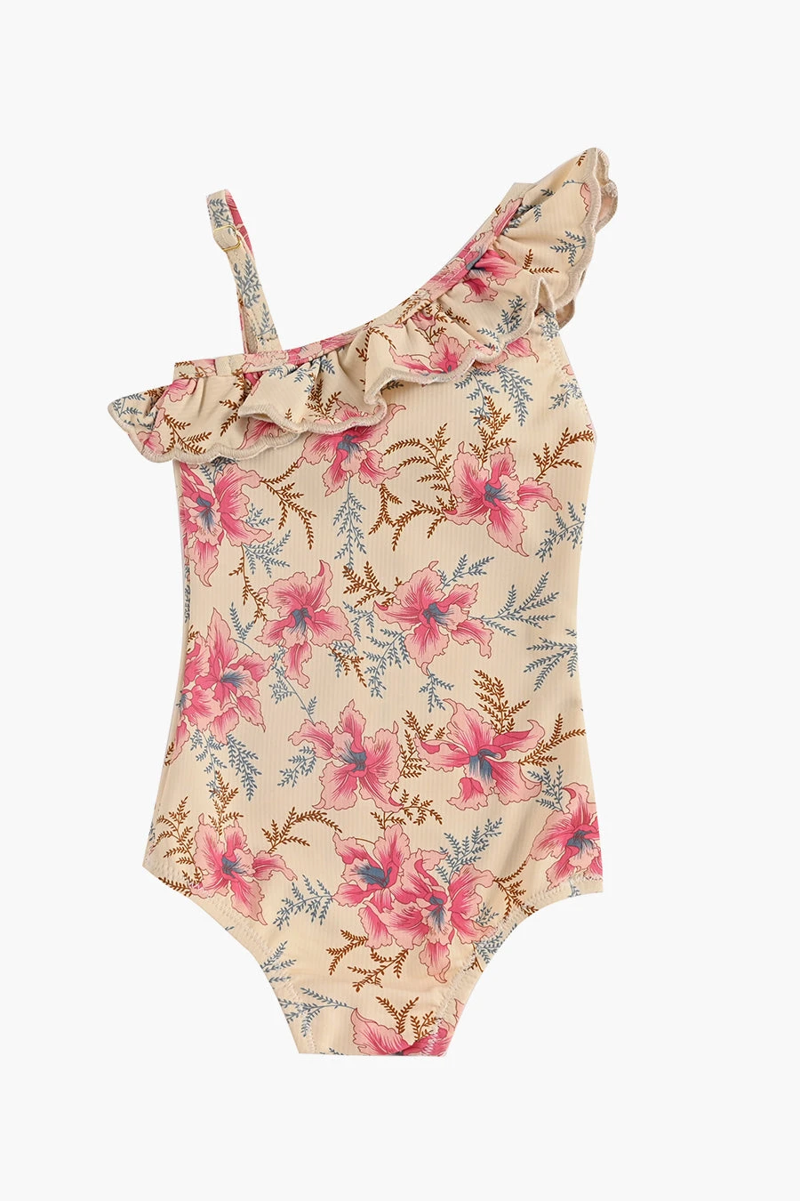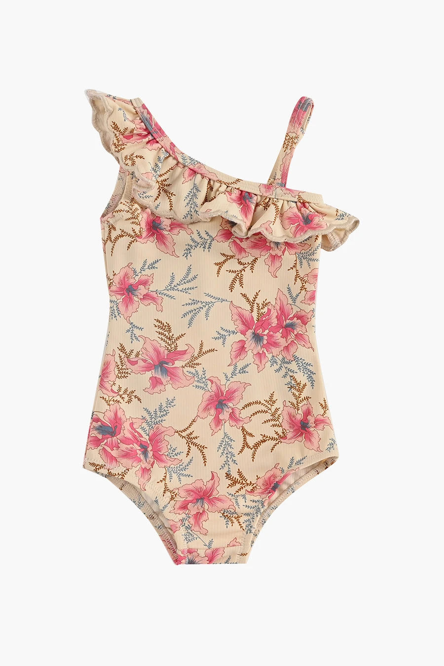 ‘s Audrey Girls Bathing Suit is an adorable girls one-piece kids swimsuit in a beautiful floral print. Features an asymmetric ruffle shoulder and neckline detailing with strap. 87% polyester, 13% knit, rinse and hang to dry.