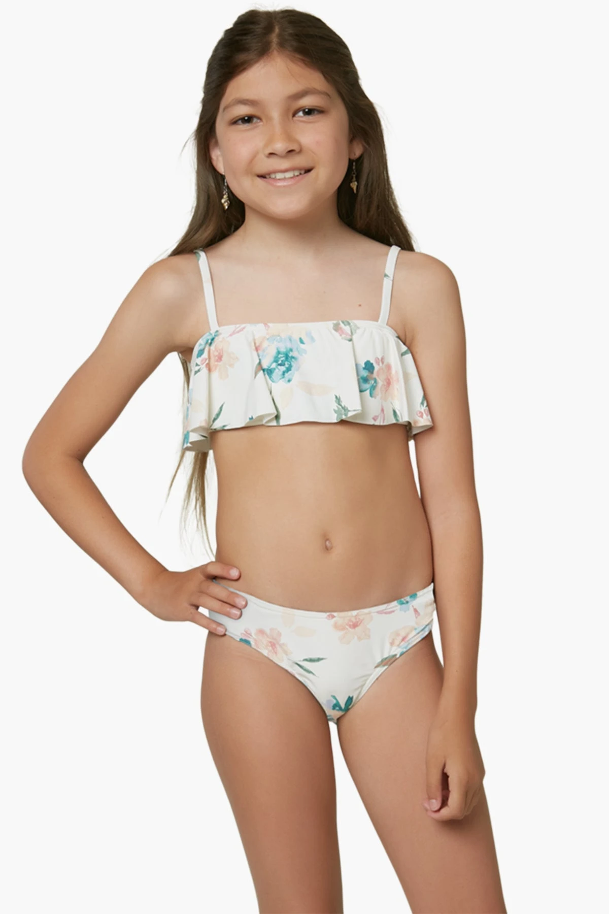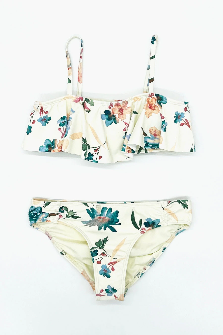 swimsuit with a large ruffle around the top. Removable bra cups for sizes 10-14. Made of 85% polyamide and 15% elastane, rinse and hang to dry.