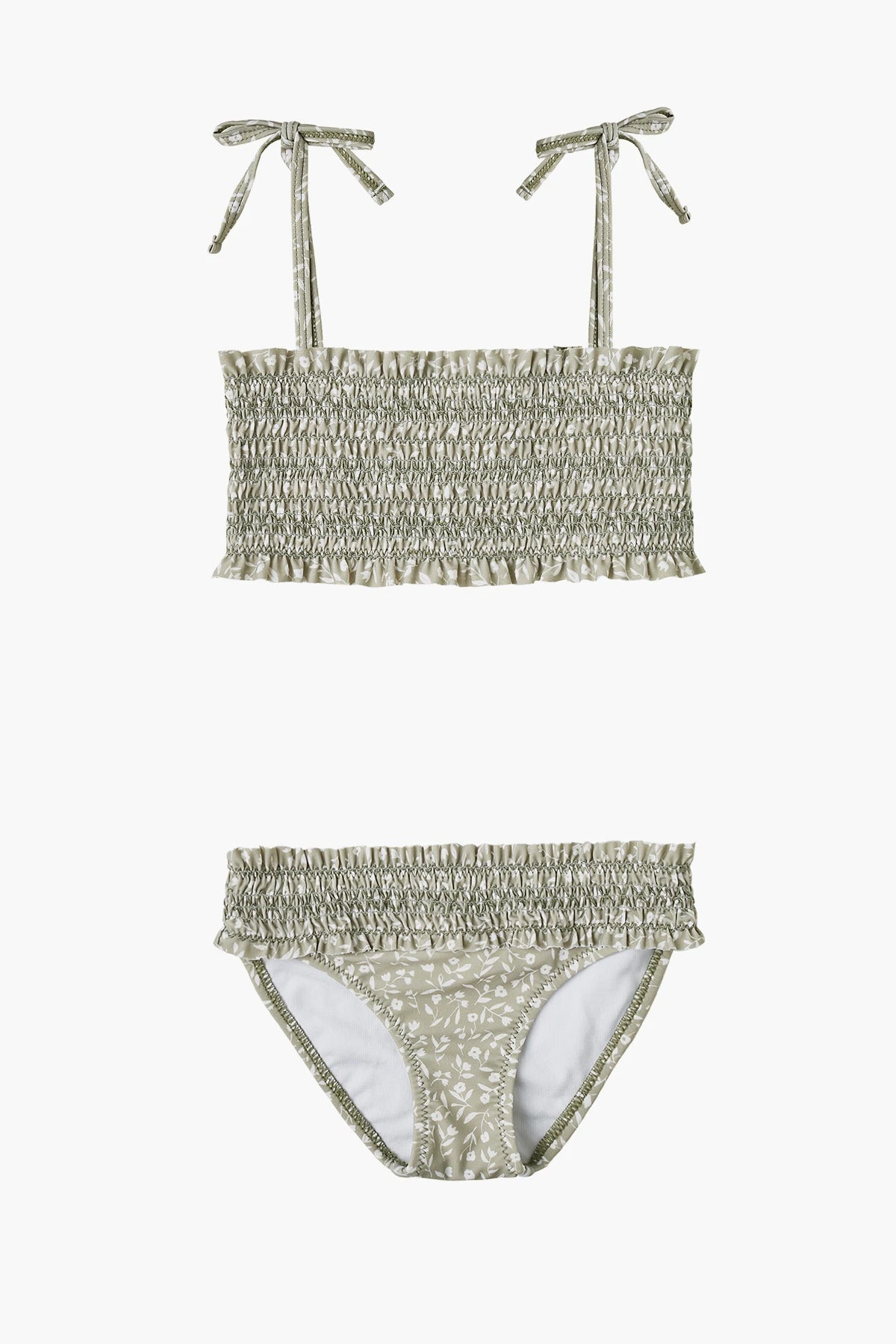 with tie shoulder straps for a perfect fit. Features a light green color with a floral print. Made of 80% nylon and 20% elastane, machine wash gentle cold.