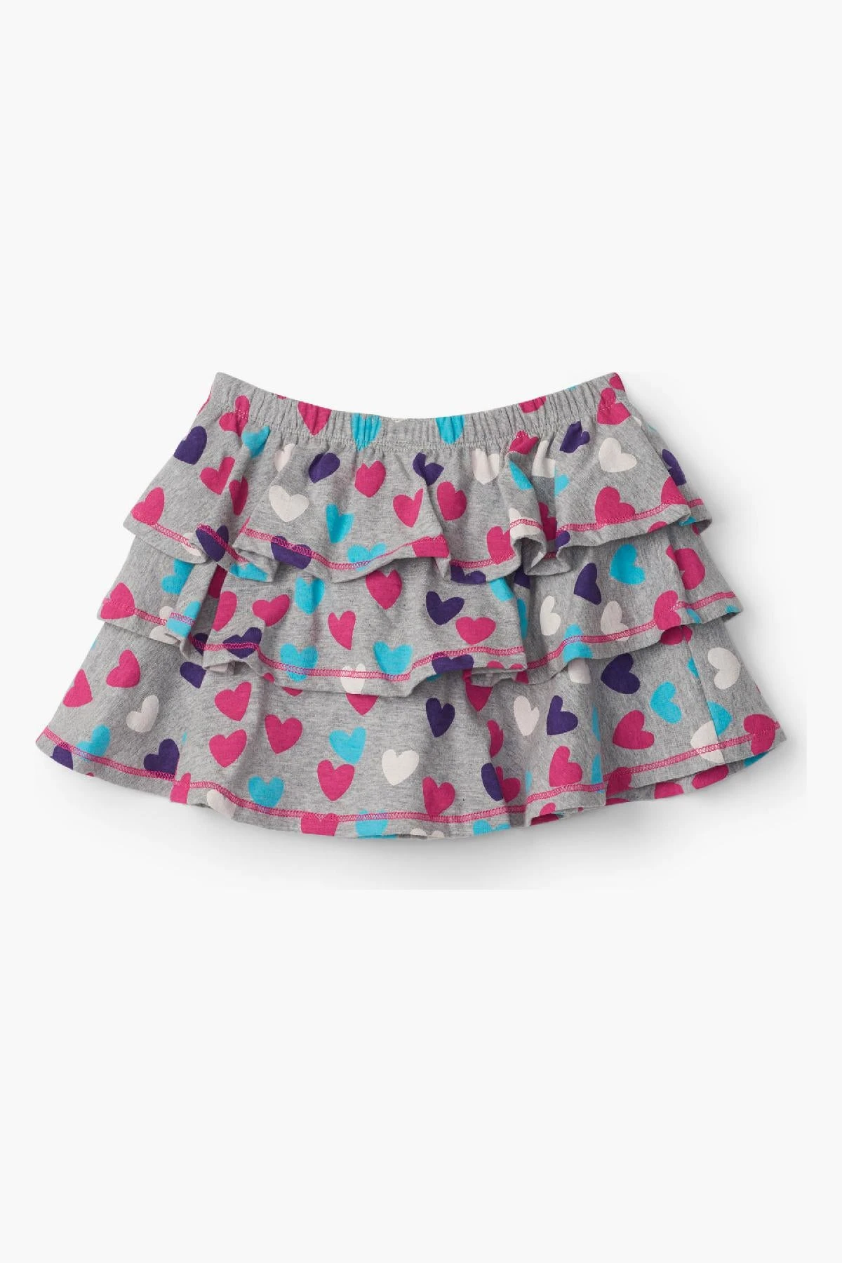 features three tiers of ruffles, an allover multicolor heart print, a decorative bow on the front and an elastic waistband. 100% cotton, machine wash.