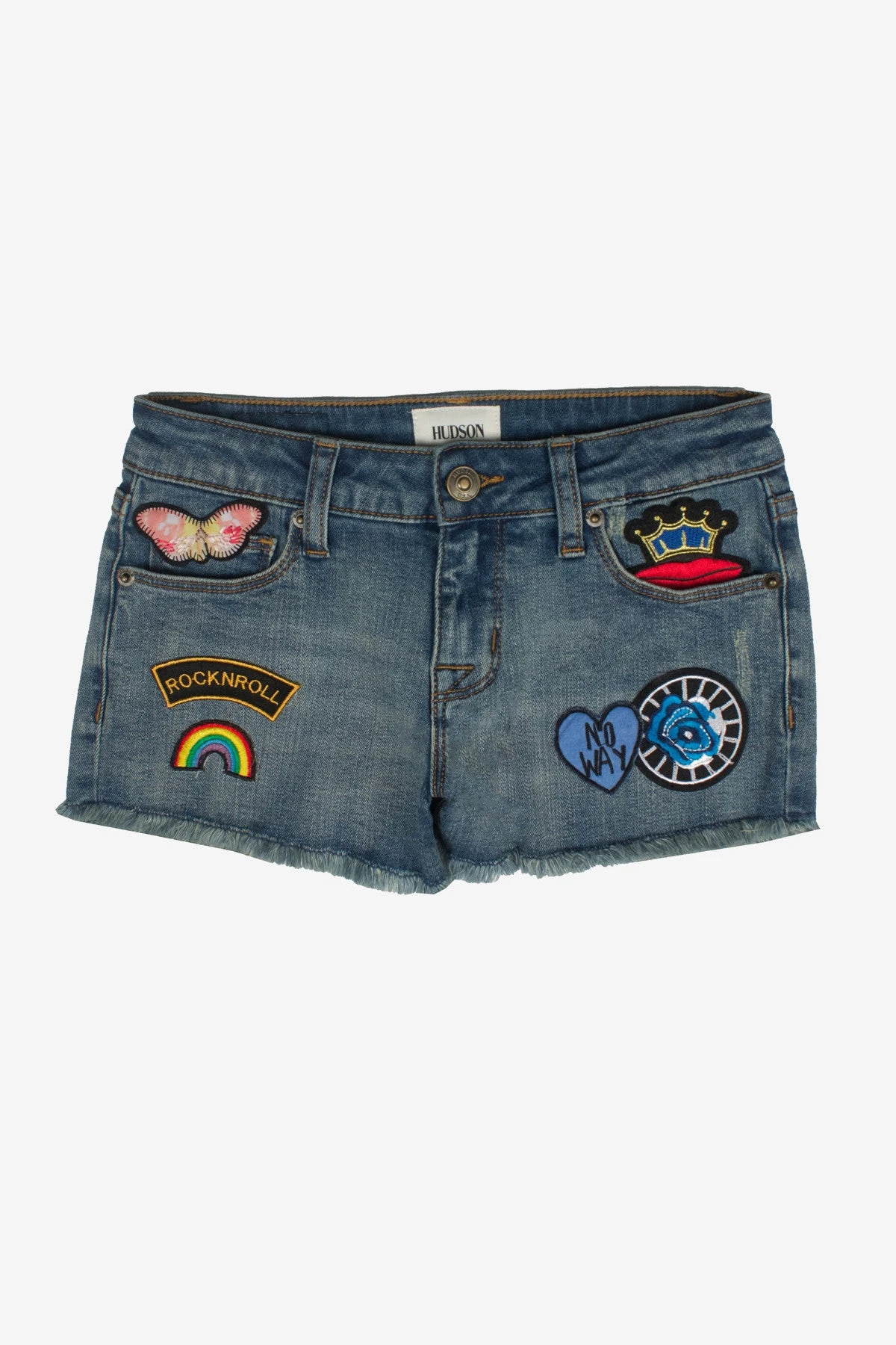 in a dark wash with fun patches on the front and back. Features a 2.5″ inseam, zipper and snap button on the front and adjustable waistband.