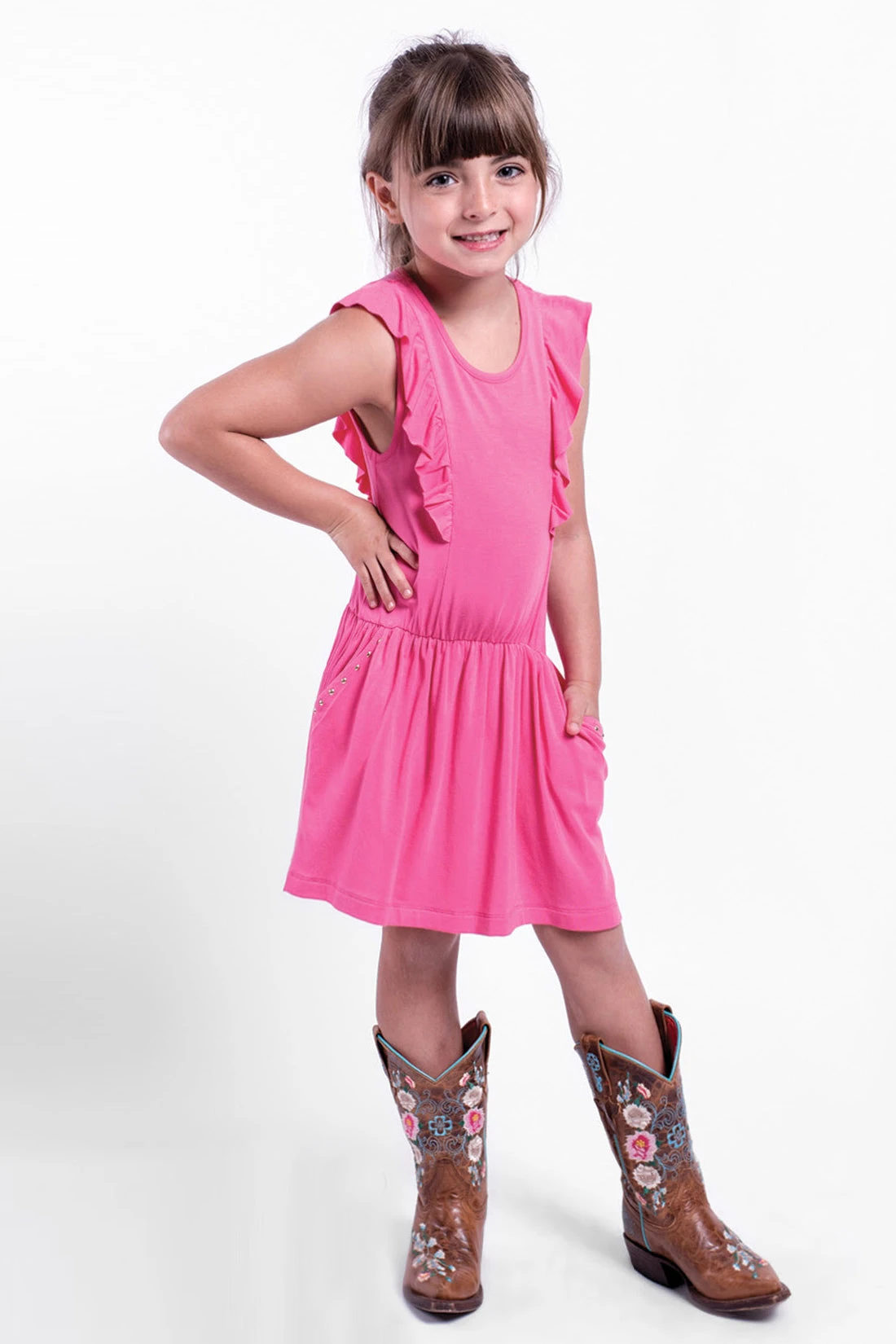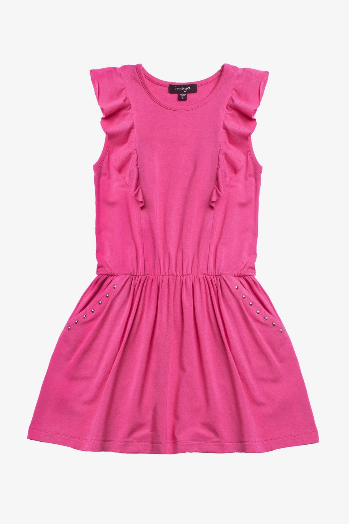 in a candy pink color featuring ruffles over the shoulders and embellished side pockets. Made in 95% viscose, 5% spandex, machine wash cold.
