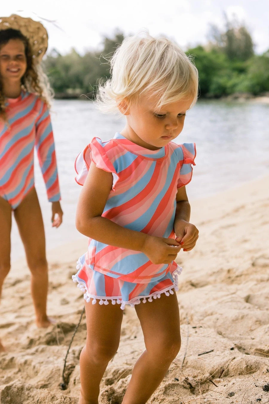 is a fun girls 2-piece set featuring a bold design with ruffle detailing along the top and bottom and UPF 50+ sun protective fabric. 80% nylon, 20% elastane, machine wash cold.