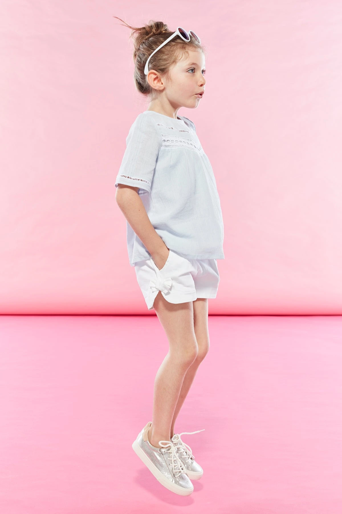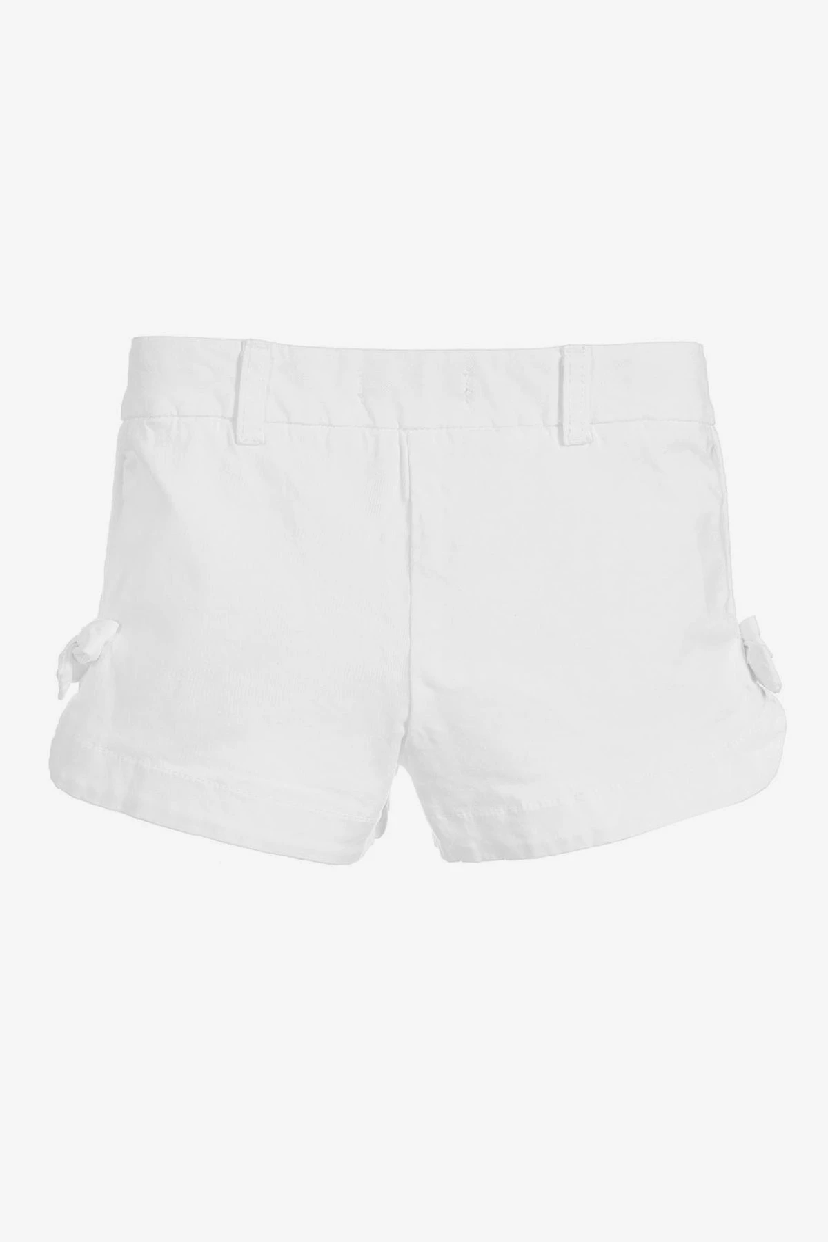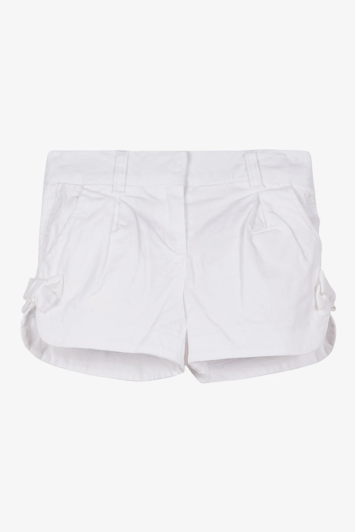 with little bows at the sides. Features side pockets, belt loops, front zip and snap closure and adjustable waistband. 98% cotton, 2% elastane, machine wash.