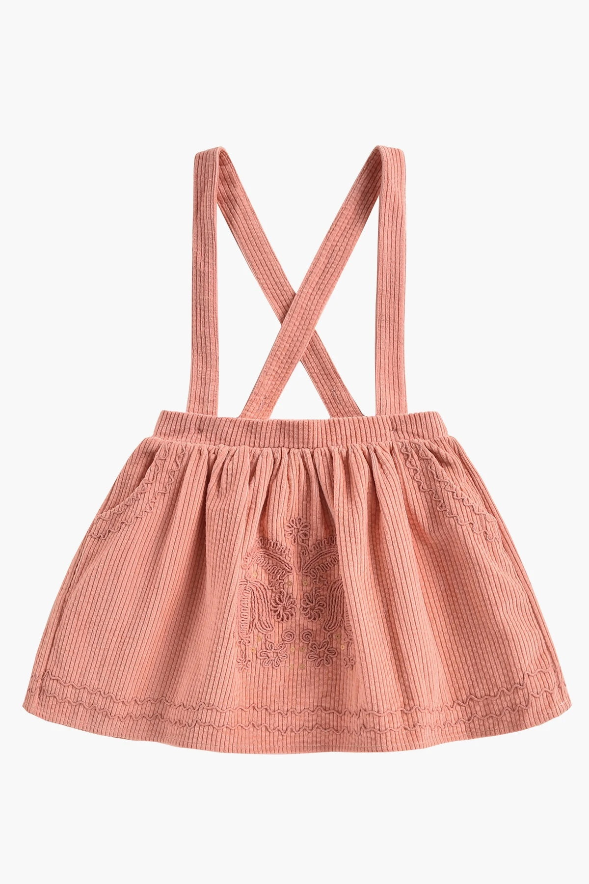 decorative embroidery and sequins, front pockets, an elastic waist, and adjustable straps. Pair with favorite