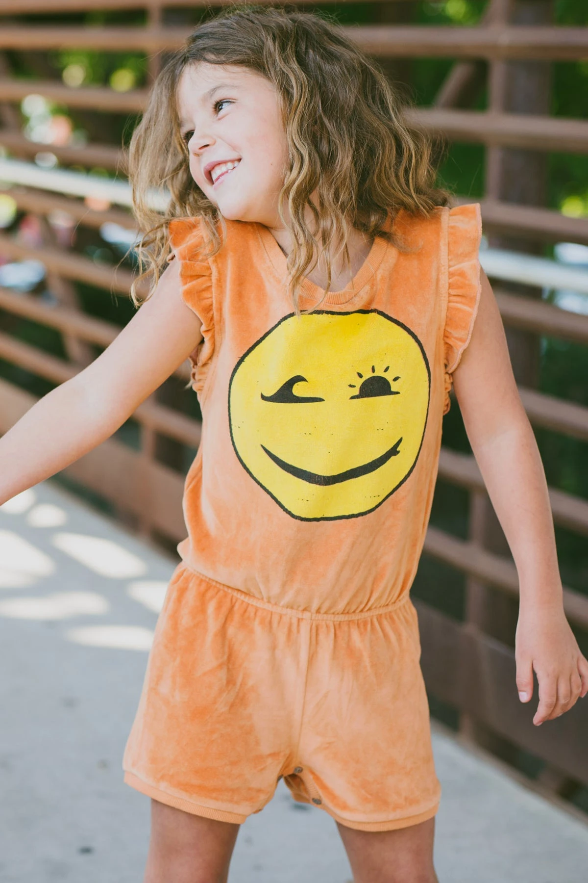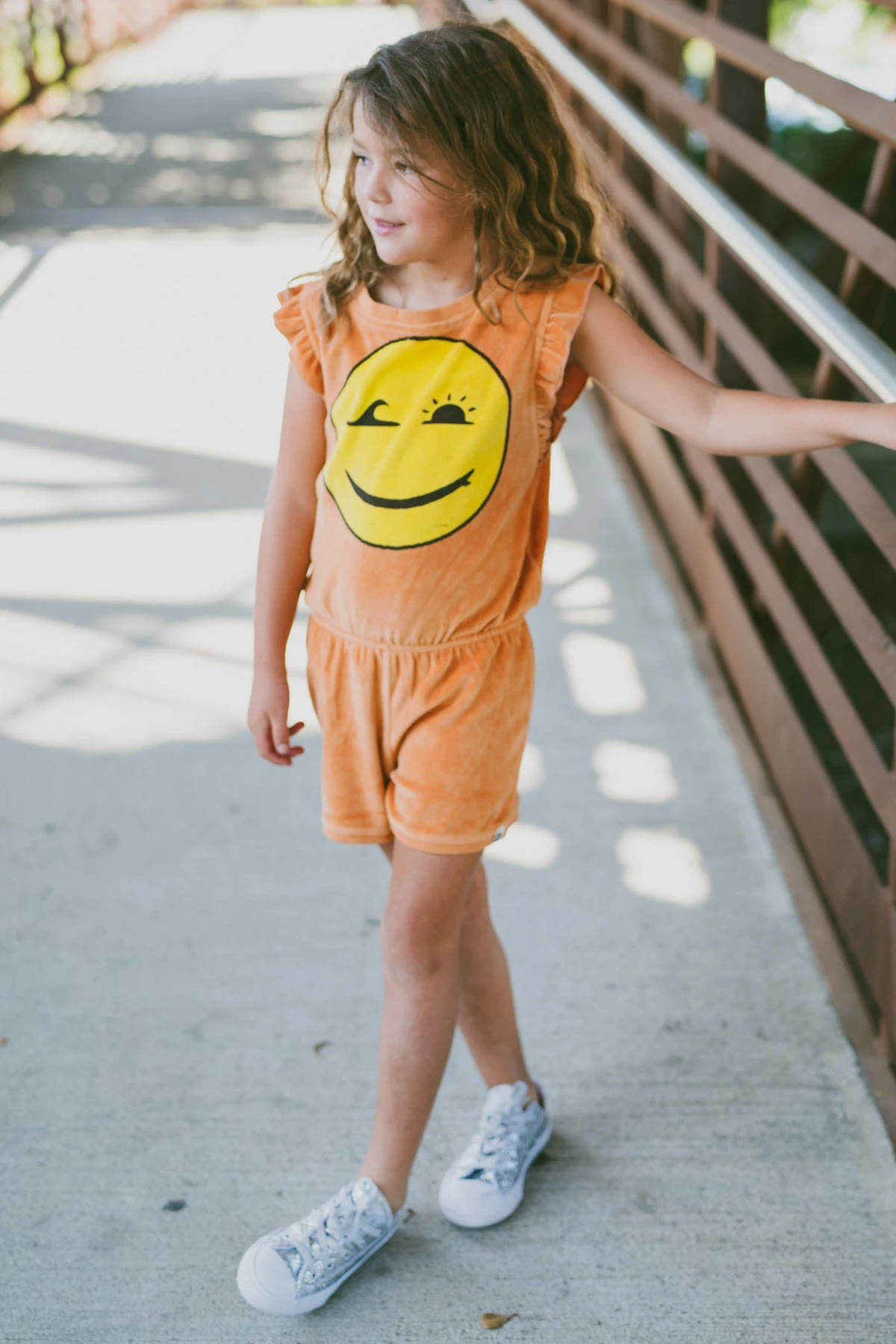 with a smiley face print on the front. 80% cotton, 20% polyester, machine wash.