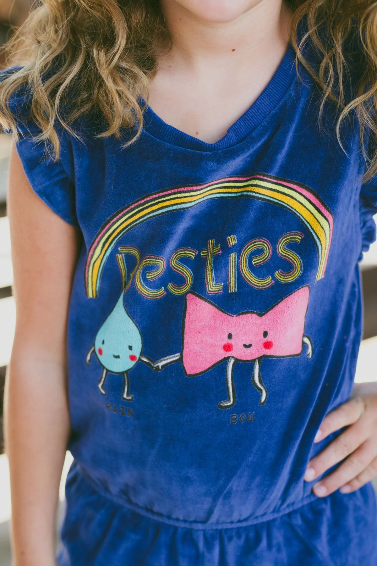 celebrating besties and friendship through the compound word, Rainbow. 95% cotton, 5% spandex, machine wash.
