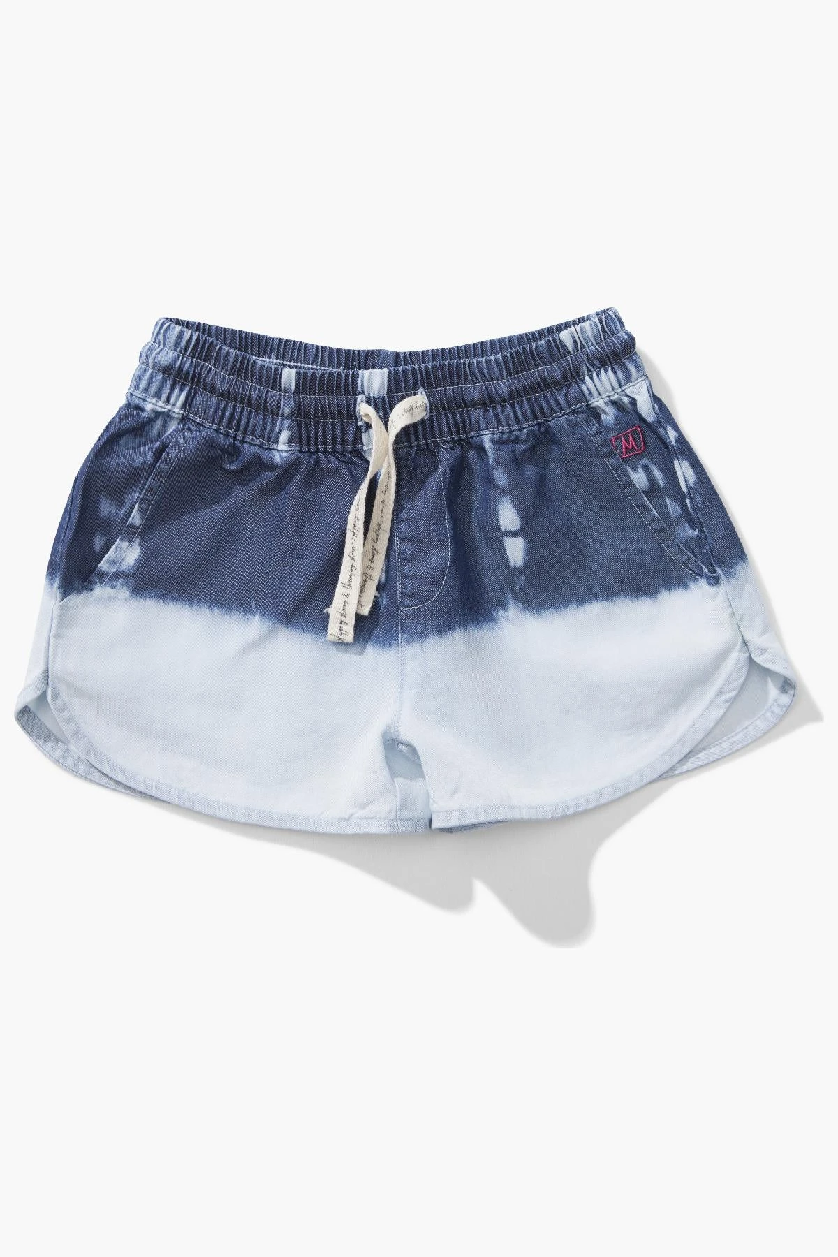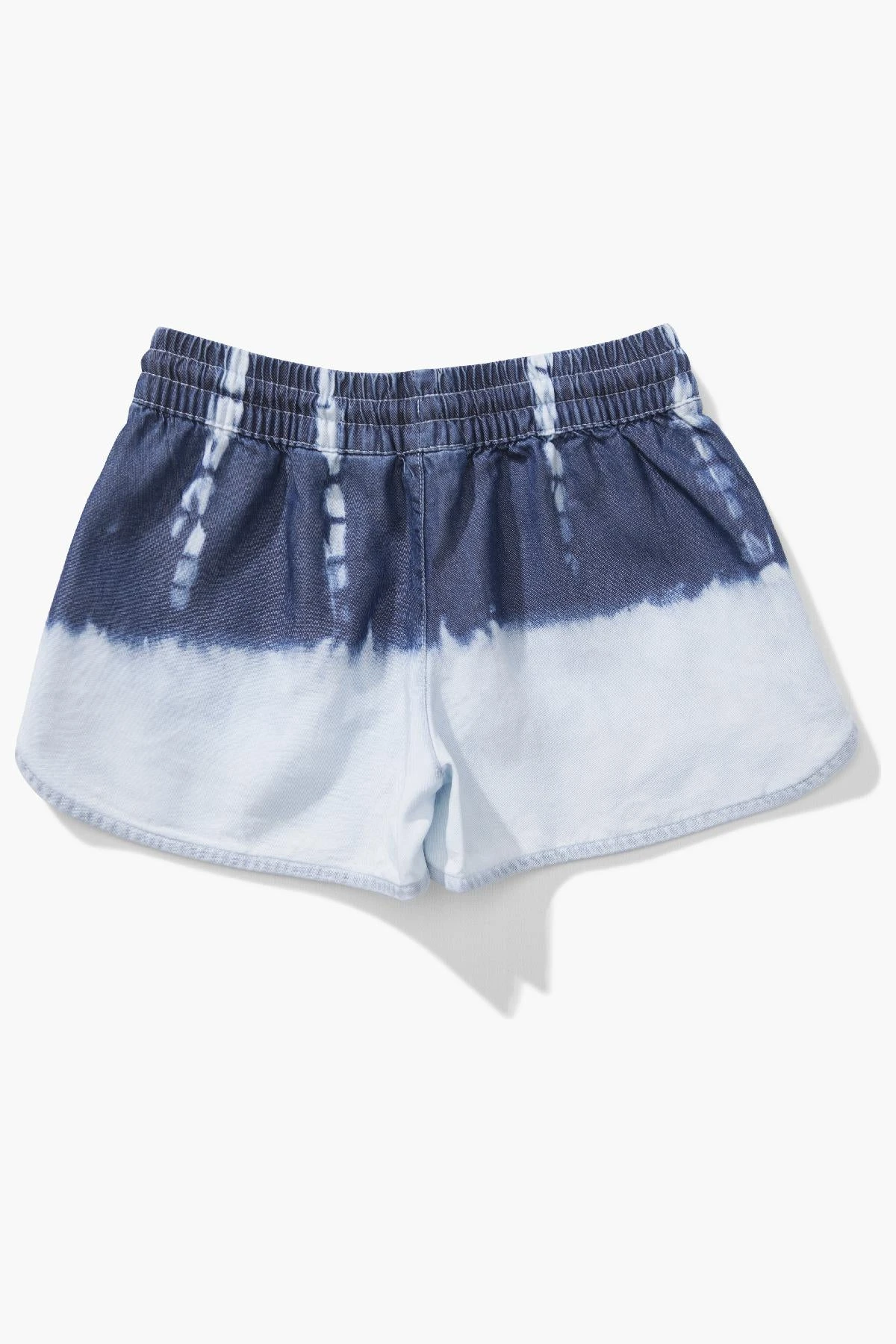 is a lightweight chambray short that features a blue dip dye effect pattern, front pockets, and an elastic waist for comfort and