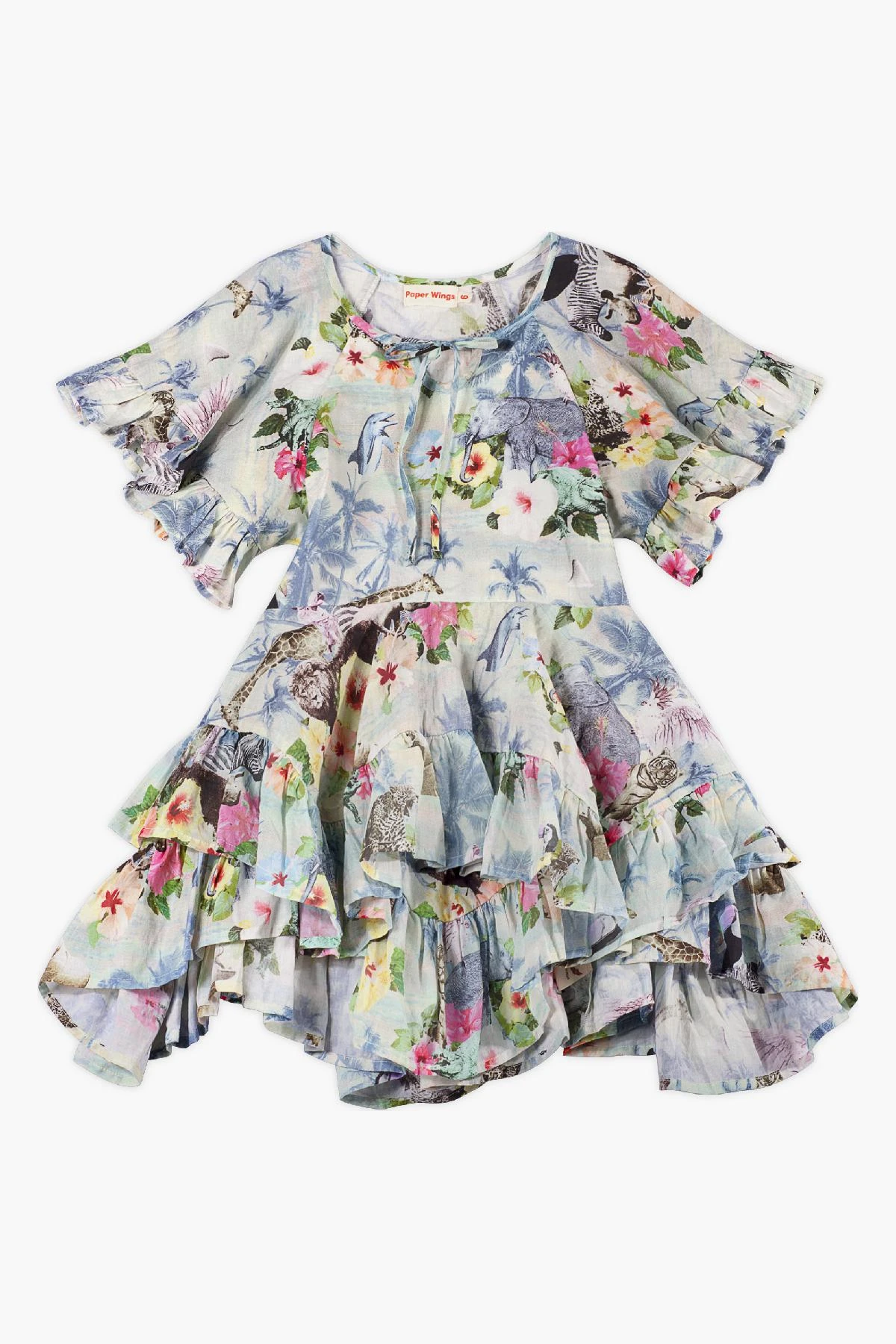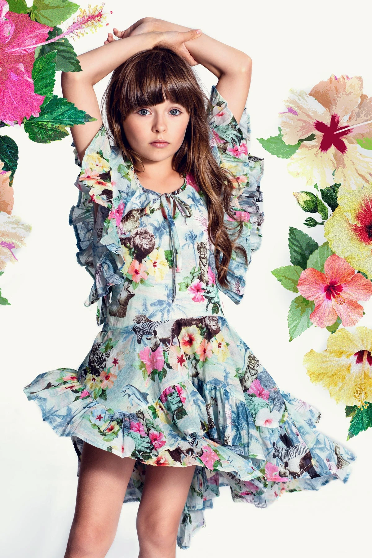 with ruffle accents on the sleeves and an uneven ruffle skirt hem for added style. Features an adjustable tie at the back for comfort with an all over animal and flower print. 100% viscose, machine wash cold.