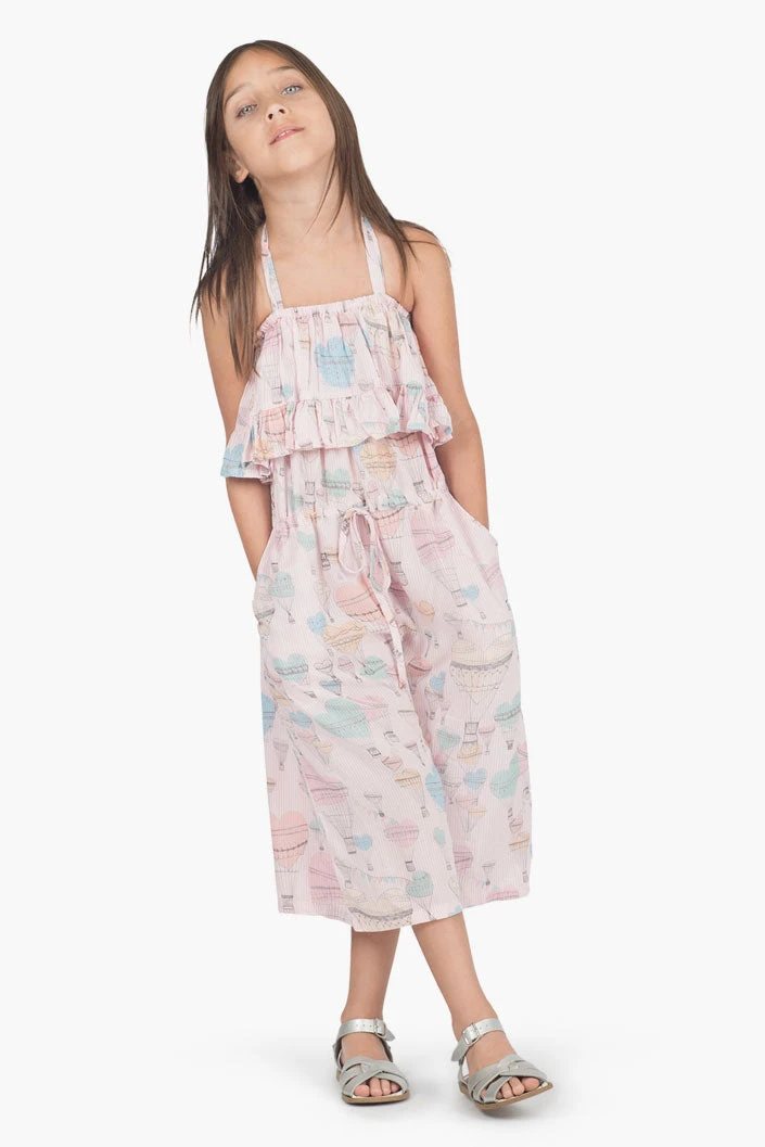 with a wide ruffle at the top, a drawstring waist and a halter-neck style closure. 100% rayon, machine wash.
