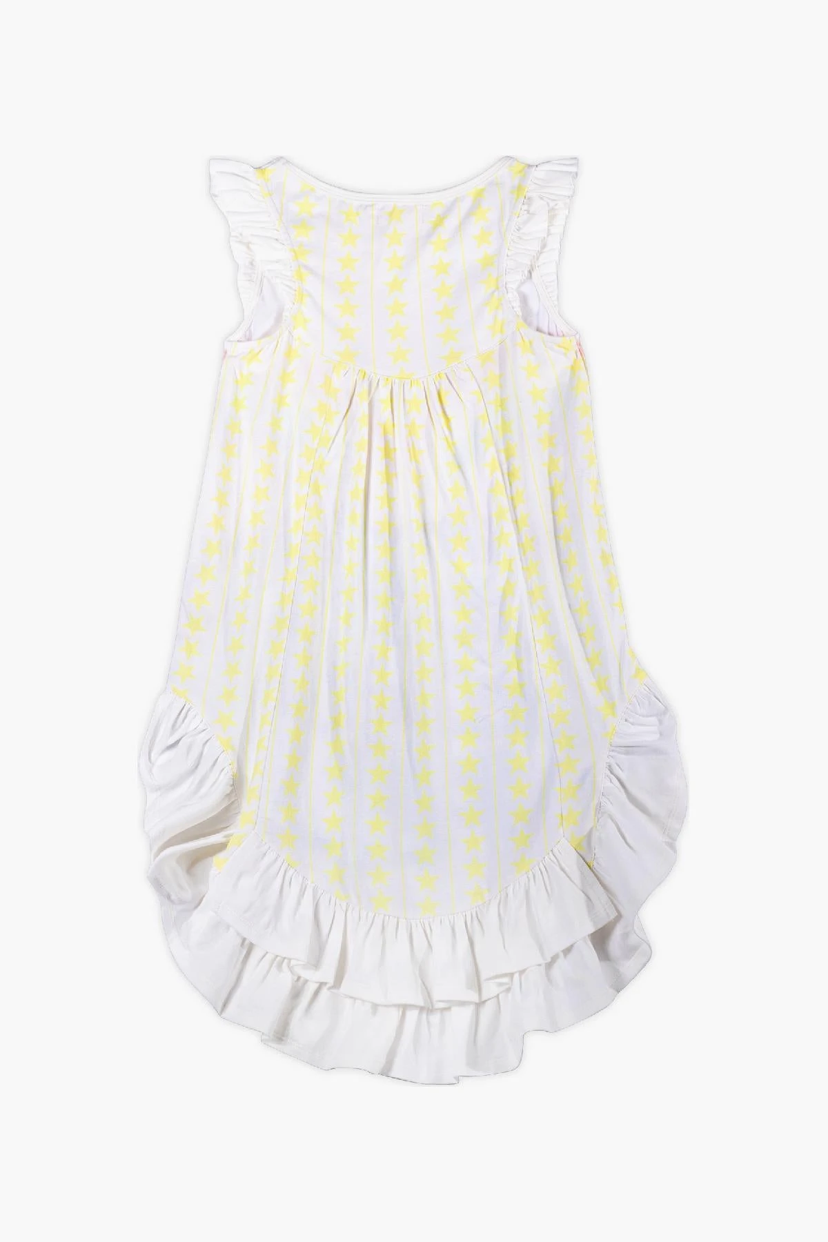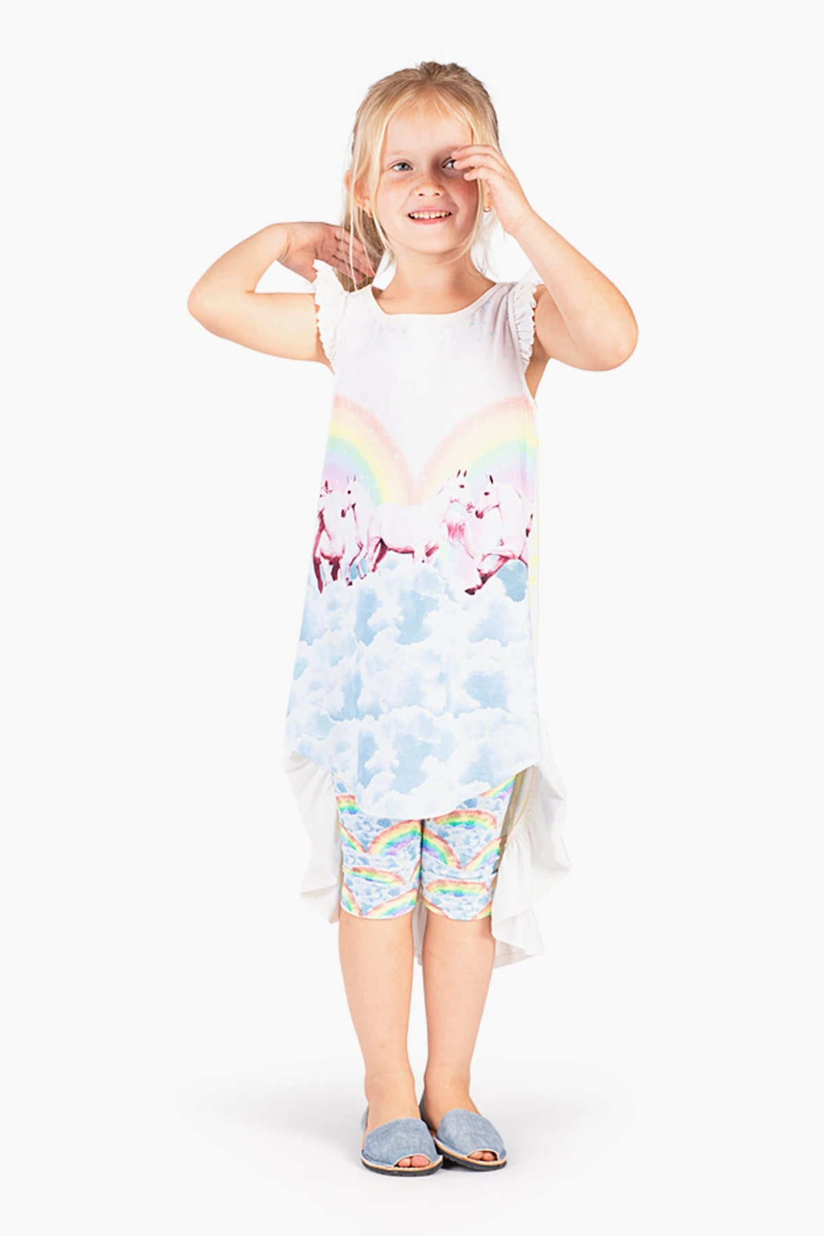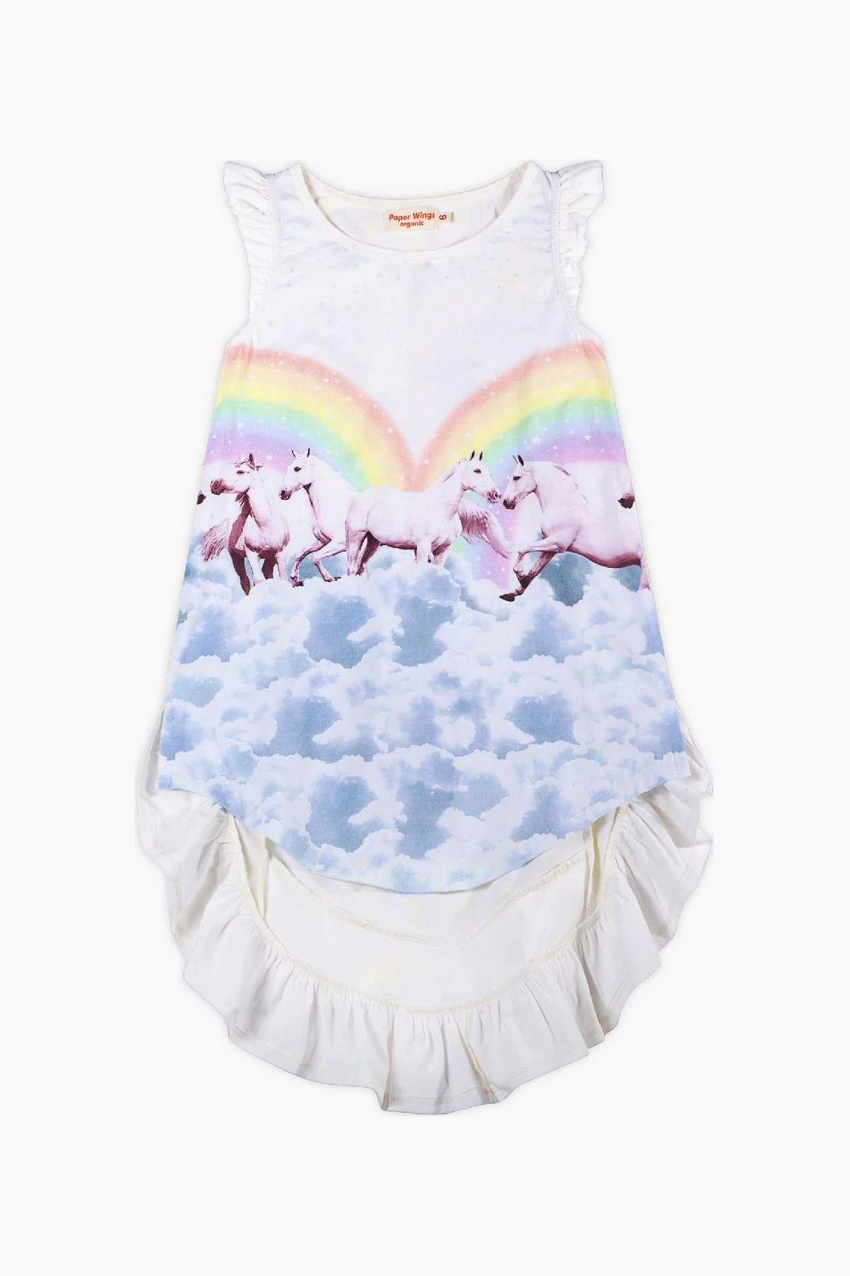 with a dreamy rainbow and horse themed print. Features a hi-low bottom with a ruffle hem, ruffle accents on the shoulders and a contrast yellow stripe pattern on the back.