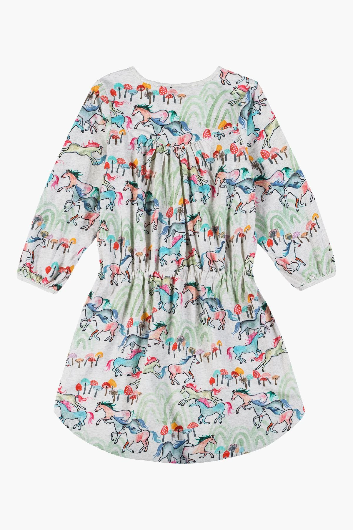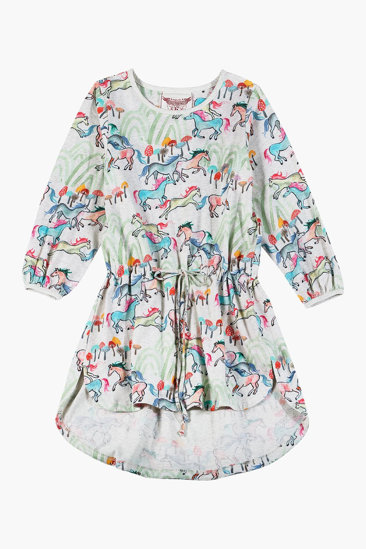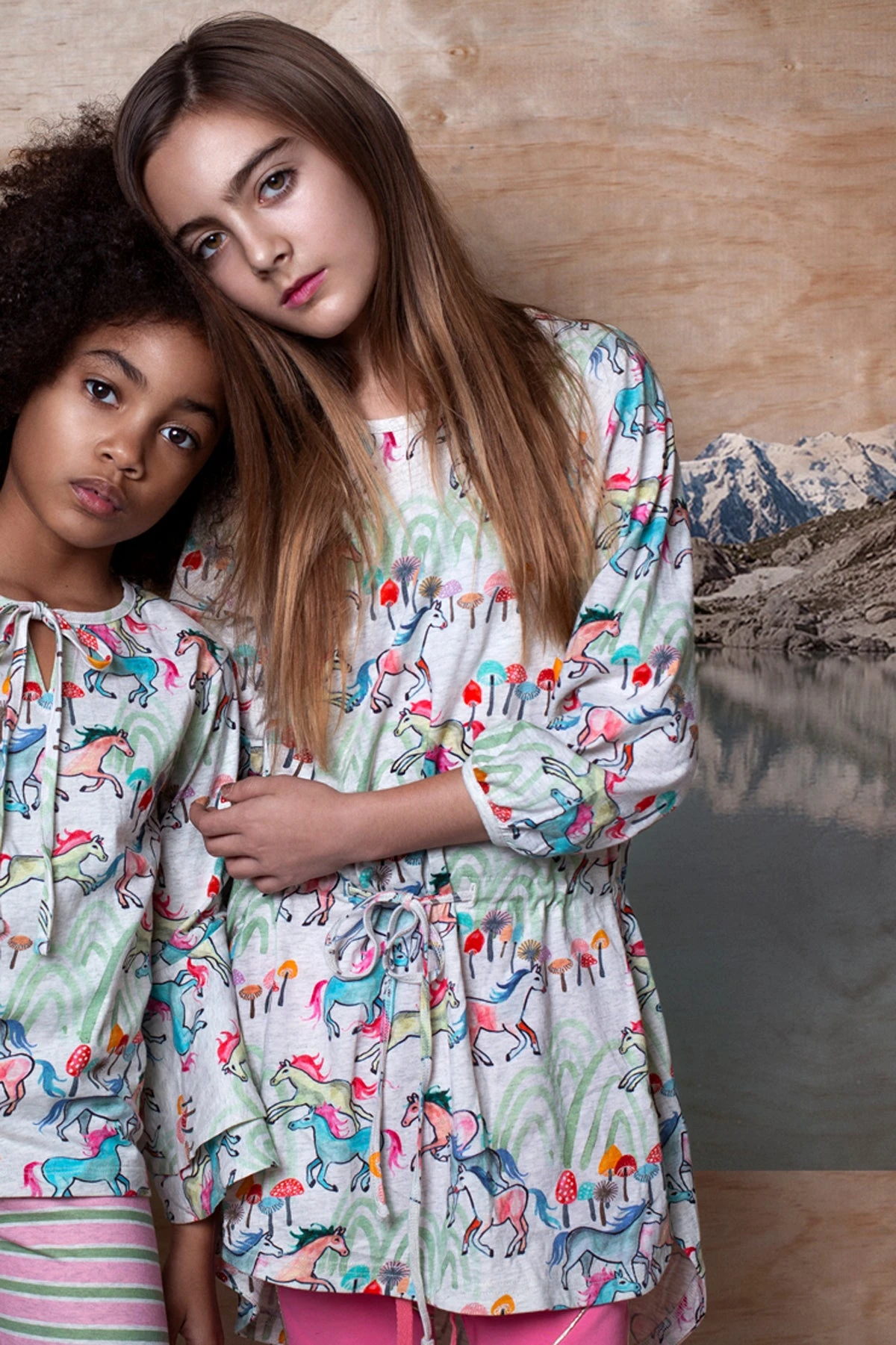 features a colorful horse print, a drawstring waist, and an asymmetrical cut along the bottom hemline. 100% organic cotton knit, machine wash cold.