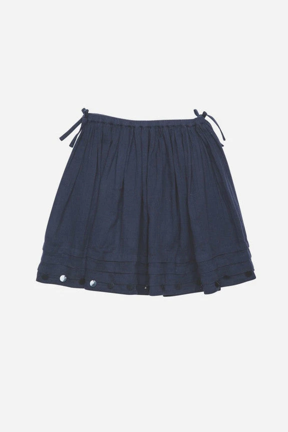 in a navy cotton crepe is made with an elasticized waist, bows on the sides and paillette sequins along the bottom for added sparkle.