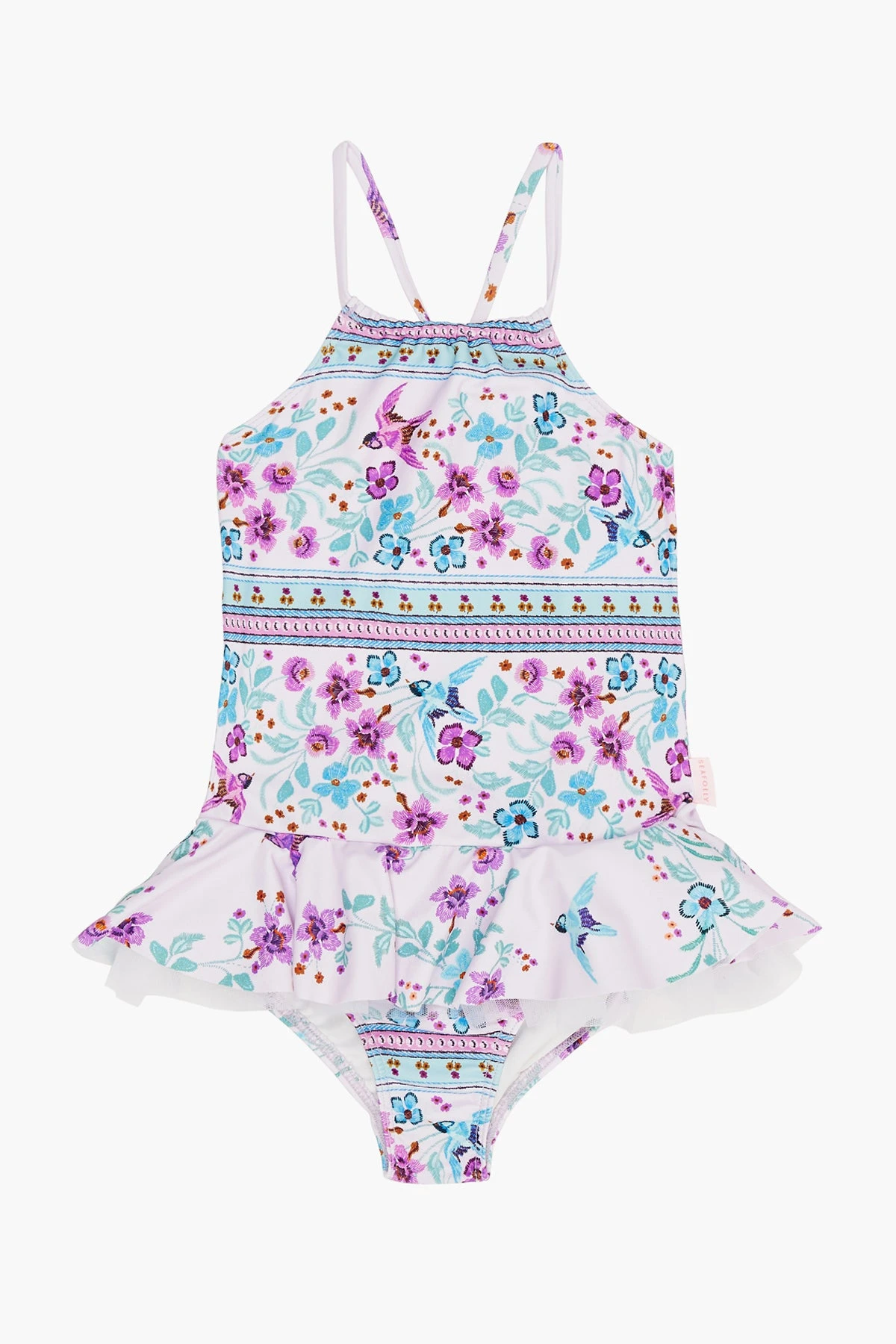 serves style and sophistication. The Apron Girls Swimsuit features a large overlay ruffle around the waist and a high neck. Made of 80% polyester and 20% extra-life elastane, machine wash cold and hang to dry.