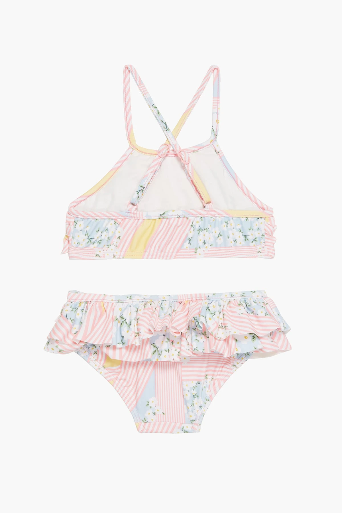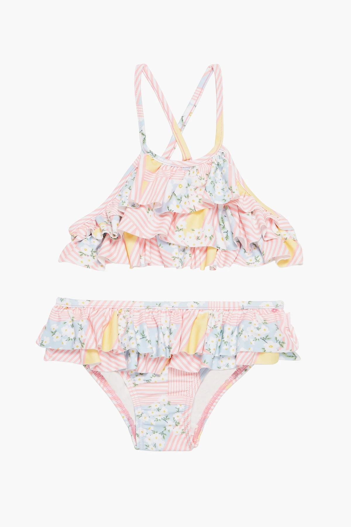 features layered frills along the top and bottom. Made of 80% polyester and 20% extra-life elastane, machine wash cold and hang to dry.