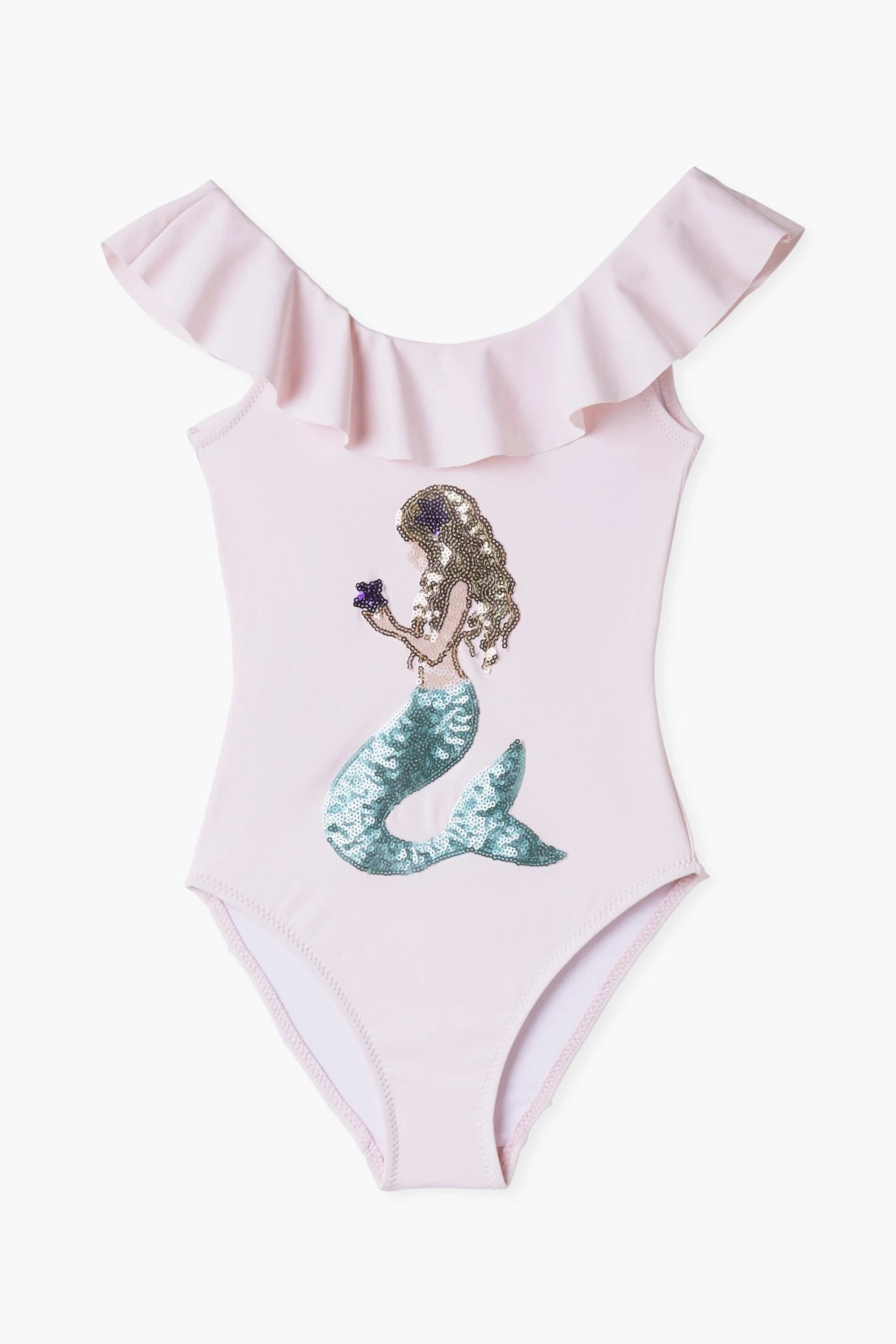Swimsuit features a large ruffle along the top and a beautiful sequin mermaid on the front. Made of 90% polyamide and 10% elastane. Hand wash cold, line dry.
