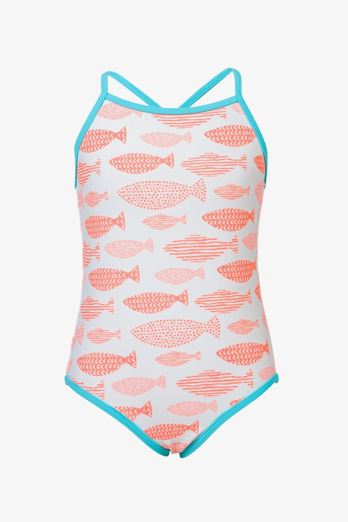 Featuring a tropical fish print with aqua accents in a classic crossback style