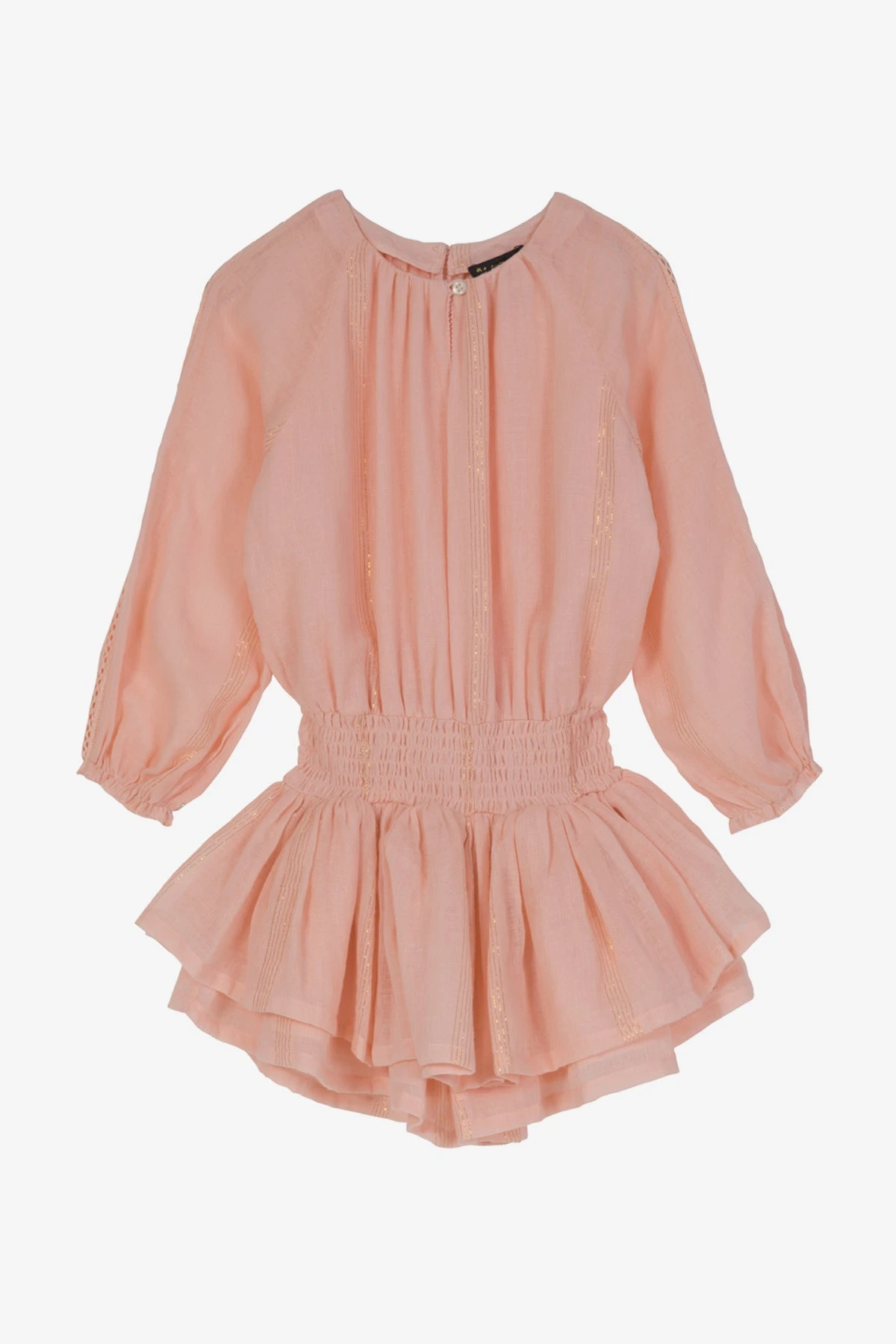 is a skort playsuit made with skirted tiers over shorts, 3/4 sleeves and a gathered elastic waist. 97% cotton, 3% lurex, machine wash cold.