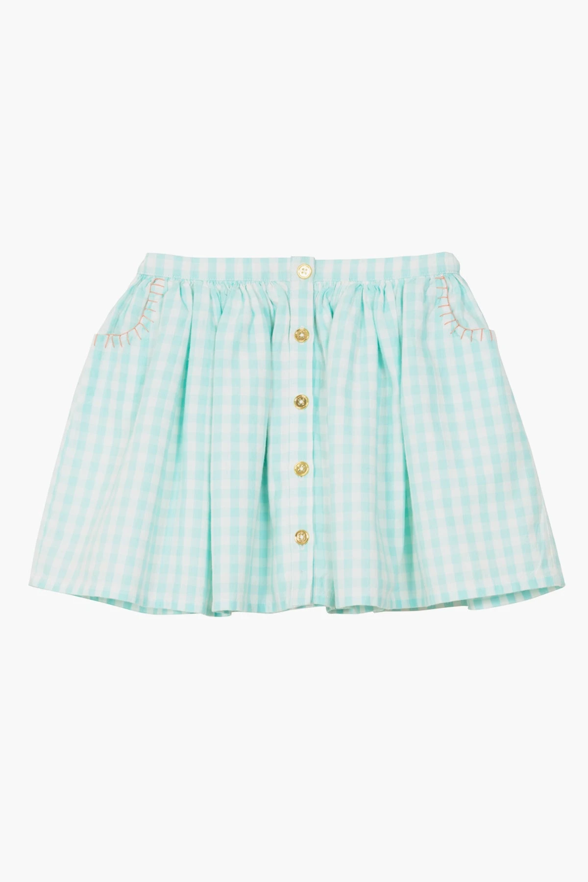 in a blue gingham print features buttons and embroidered detailed pockets. Pair with the matching Velveteen Ophelia