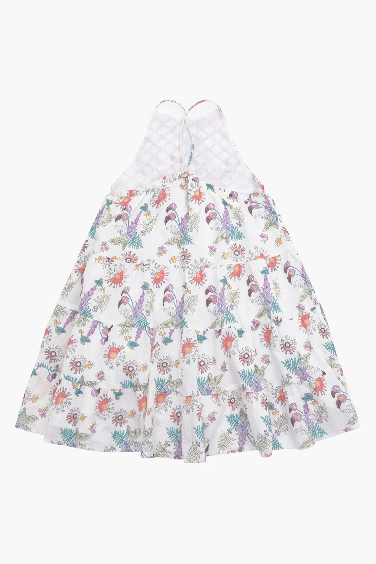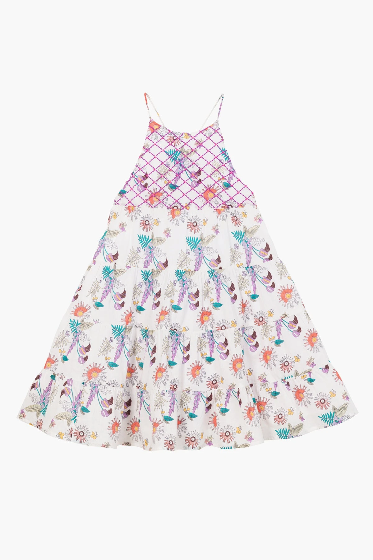 n is a tiered sundress in a floral print with shoulder straps and embroidery detailing at the bodice. 96% cotton, 4% polyester, fully cotton lined, machine wash cold, lay flat to dry.