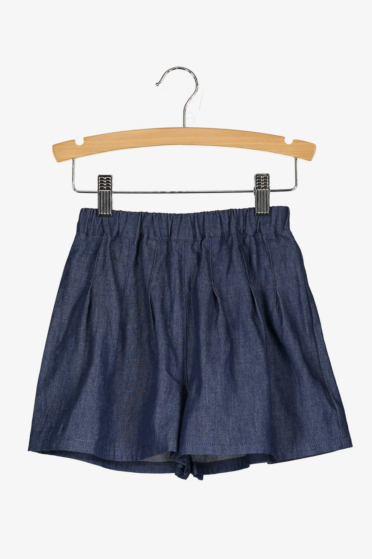 with an elastic waist in a dark denim wash. 100% cotton, machine wash.