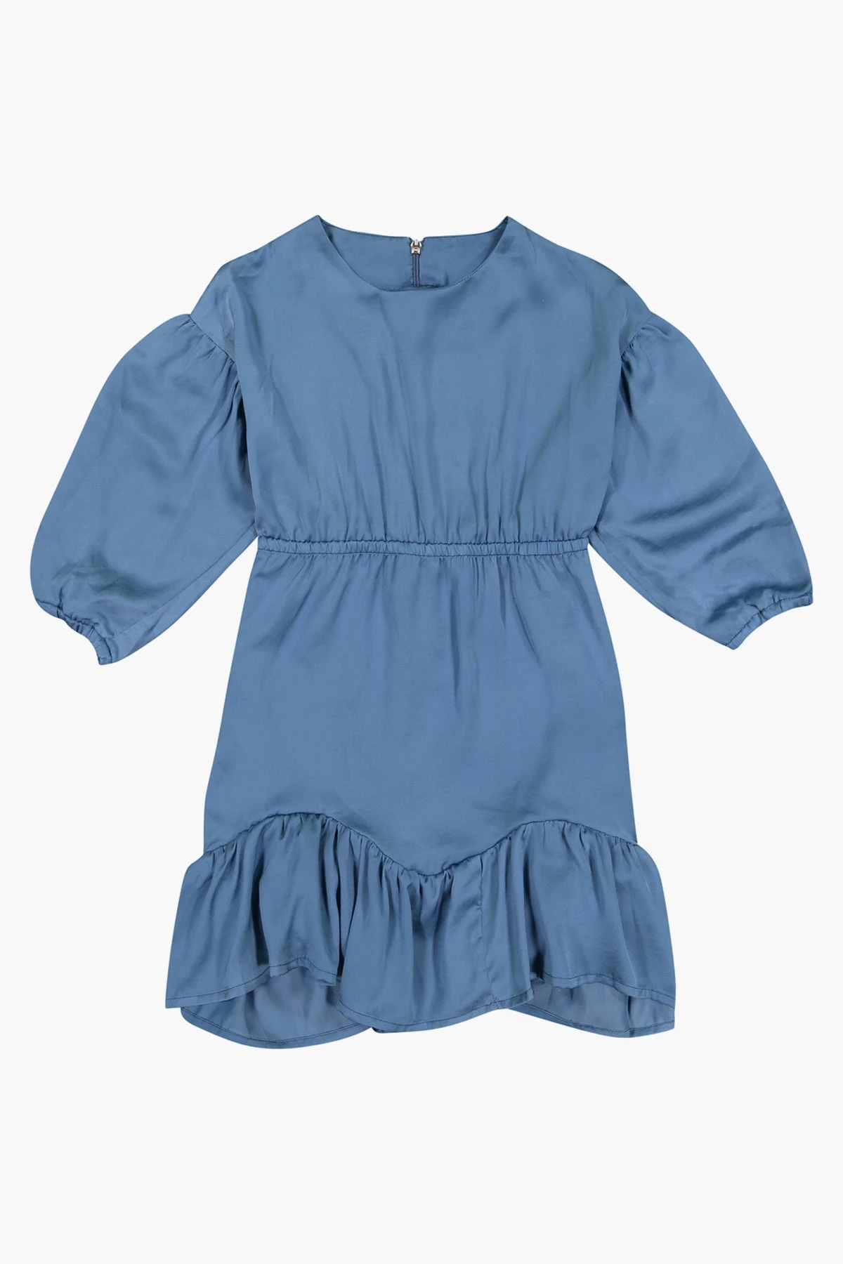 is a lovely blue sateen dress with balloon sleeves and a large ruffle around the bottom. Features a gathered waist and a zippered back. 100% polyester, machine wash.